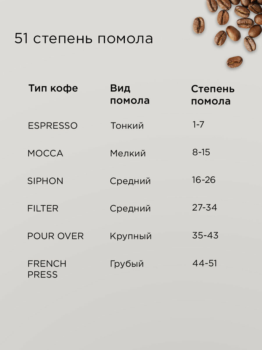 | Регулировка степени помола | есть, число степеней помола - 51 |