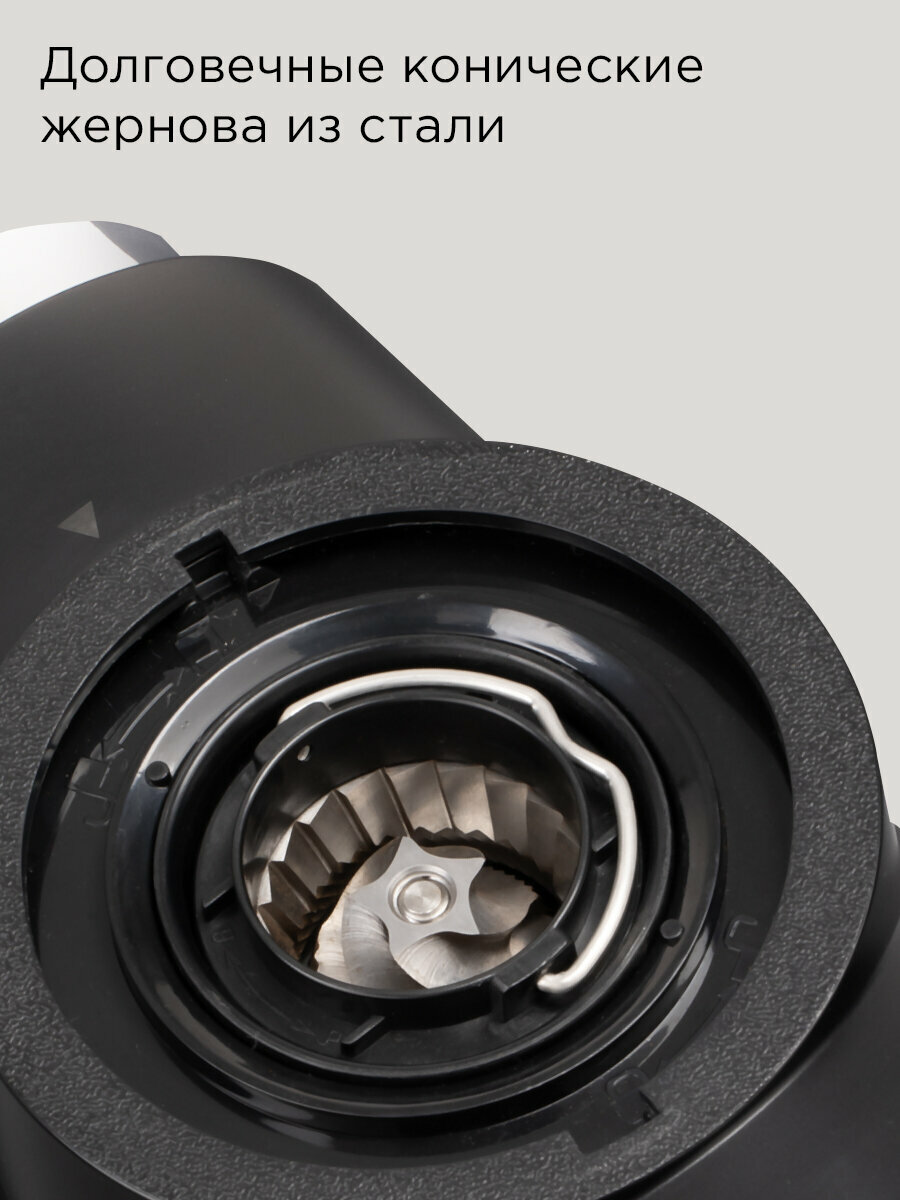 Если в контейнер для зерен случайно попадет посторонний предмет, сработает система защиты от перегрузки. Она предотвратит поломку устройства — кофемолка долго прослужит.