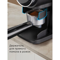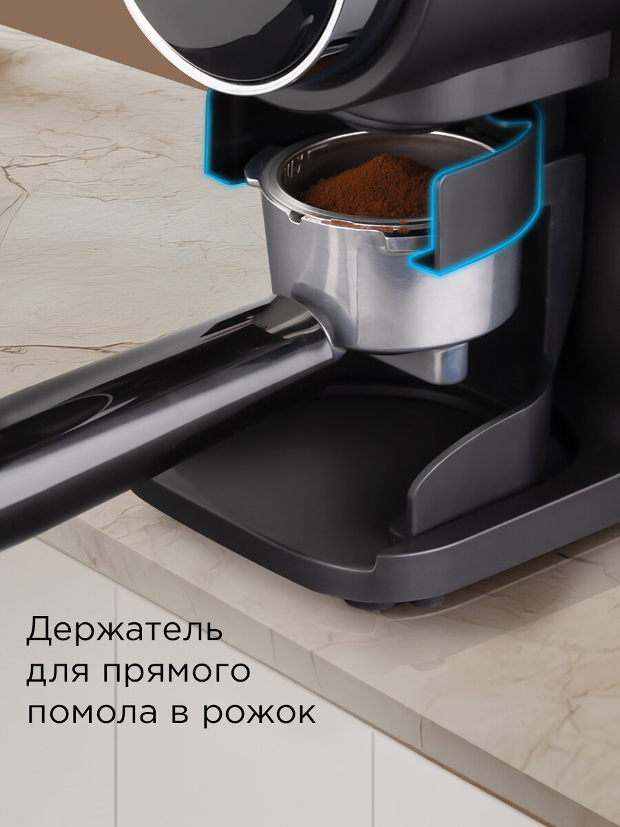 Держатель в комплекте позволит измельчить зерна прямо в рожок кофеварки. А защита от перегрузки и нескользящие устойчивые ножки обеспечат безопасность использования прибора.