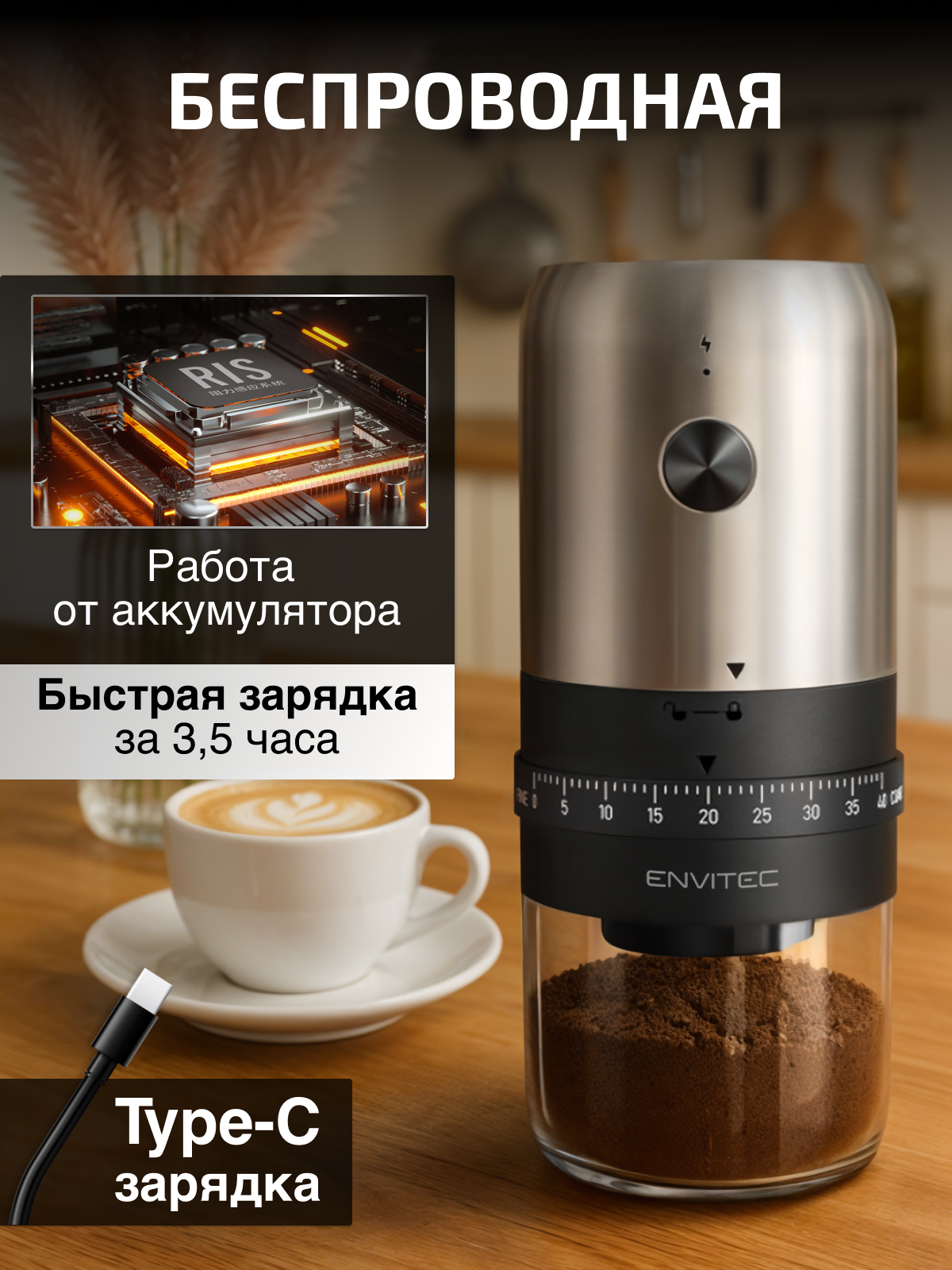 Купить Кофемолка Envitec C-Mill Lite S5, беспроводная, жернова, для регулировки степени помола, 150 Вт, 70 с доставкой по всей России.