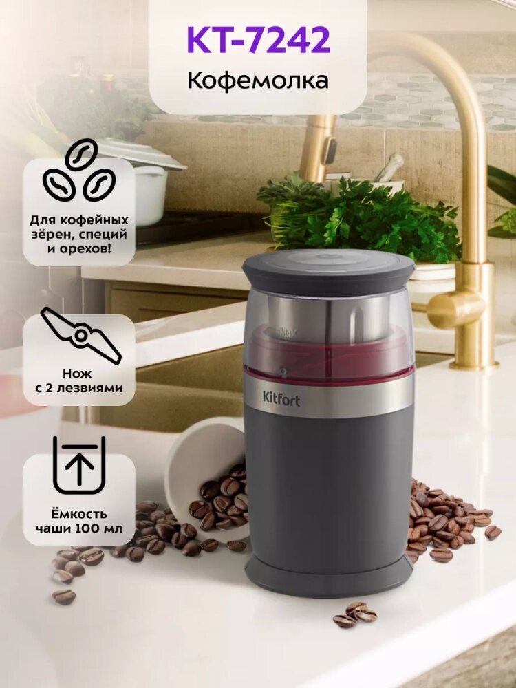 Кофемолка KitFort КТ-7242, электрическая, нержавеющая сталь, серая, 200 Вт: сравнение цен, характеристики, фото, актуальное наличие и цены.