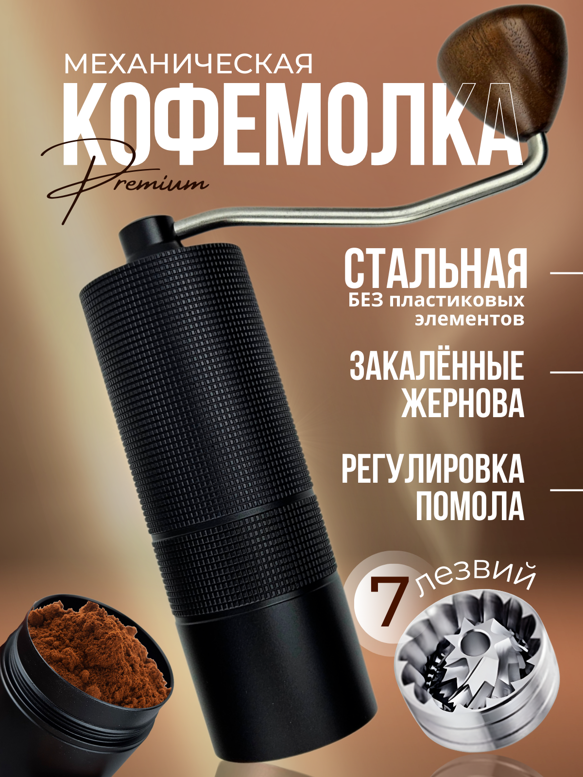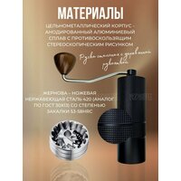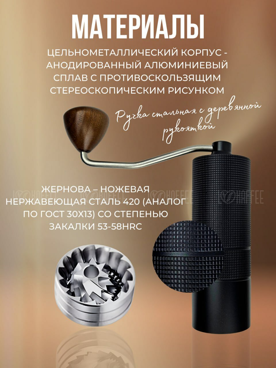 Премиальная ручная кофемолка – идеальное решение для настоящих ценителей кофе. Продуманный и надежный механизм с высокоточными деталями, в сочетании с удобством использования и стильным дизайном делает эту кофемолку не превзойденной в своем классе. Изготовлена без использования пластиковых элементов, с цельнометаллическим корпусом из алюминиевого сплава с анодированным покрытием черного цвета. На корпус нанесен тактильно и визуально приятный стереографический рисунок. Стальная ручка с эргономичной деревянной рукояткой обеспечивает комфортное использование и позволяет с легкостью перемалывать кофейные зерна. Конические жернова из специальной ножевой нержавеющей стали марки 420 закаленной до 53-58HRC обеспечивают долговечность вашей кофемолки без износа жерновов. Центральная ось, зафиксированная между двумя запрессованными в корпусе радиальными подшипниками, обеспечивает идеальное вращение механизма без люфтов. Это гарантирует стабильность и точность помола, а также долгий срок службы кофемолки. Ступенчатая регулировка с широким диапазоном помола позволит настроить оптимальный размер фракции кофе под любой способ приготовления кофе. 8-12 щелчков - идеально для эспрессо, 10-14 щелчков - подходит для аэропресса, а 18-24 щелчка позволят вам насладиться пуровером. Если вы предпочитаете френч-пресс, то 25-30 щелчков обеспечат вам идеальную фракцию помола.