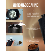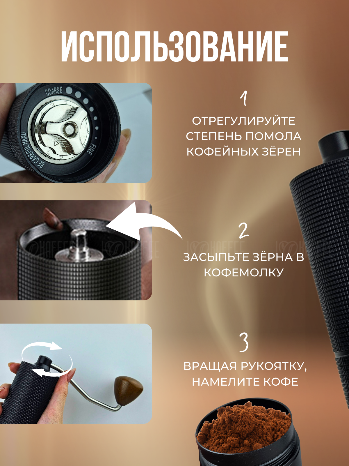 Благодаря бесшумному и автономному приводу, вы можете наслаждаться процессом помола кофе в любое время дня, не беспокоя окружающих. Ручная кофемолка превосходит электрические кофемолки своей надежностью и качественным, ровным и стабильным помолом. Наша кофемолка станет незаменимым помощником в приготовлении идеального ароматного кофе.