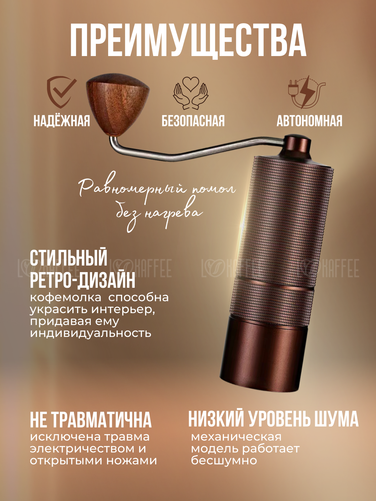 Благодаря бесшумному и автономному приводу, вы можете наслаждаться процессом помола кофе в любое время дня, не беспокоя окружающих. Ручная кофемолка превосходит электрические кофемолки своей надежностью и качественным, ровным и стабильным помолом. Наша кофемолка станет незаменимым помощником в приготовлении идеального ароматного кофе.