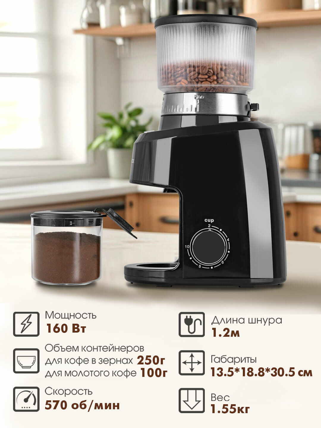 | Объем емкости для молотого кофе | 100 г |