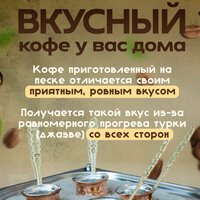 Приготовление кофе по восточному почти 800 лет. Изначально его готовили на углях, затем научились в раскаленном песке. В наше время для варки кофе по восточному появились ящики (аппараты) с нагревательными элементами, наполненные песком. Аппарат работает от розетки 220 v. В комплект входит песок и 4 турки 120 мл. Кофе приготовленный на песке отличается своим приятным, ровным вкусом. Получается такой вкус из-за равномерного прогрева турки (джазве) со всех сторон.