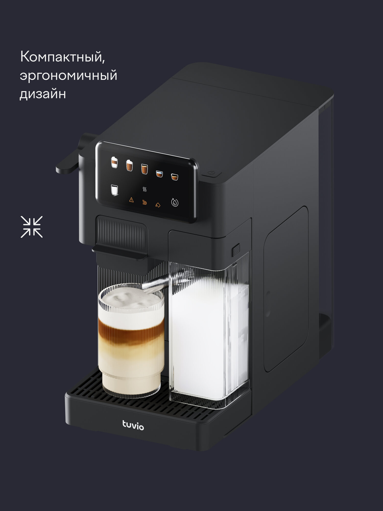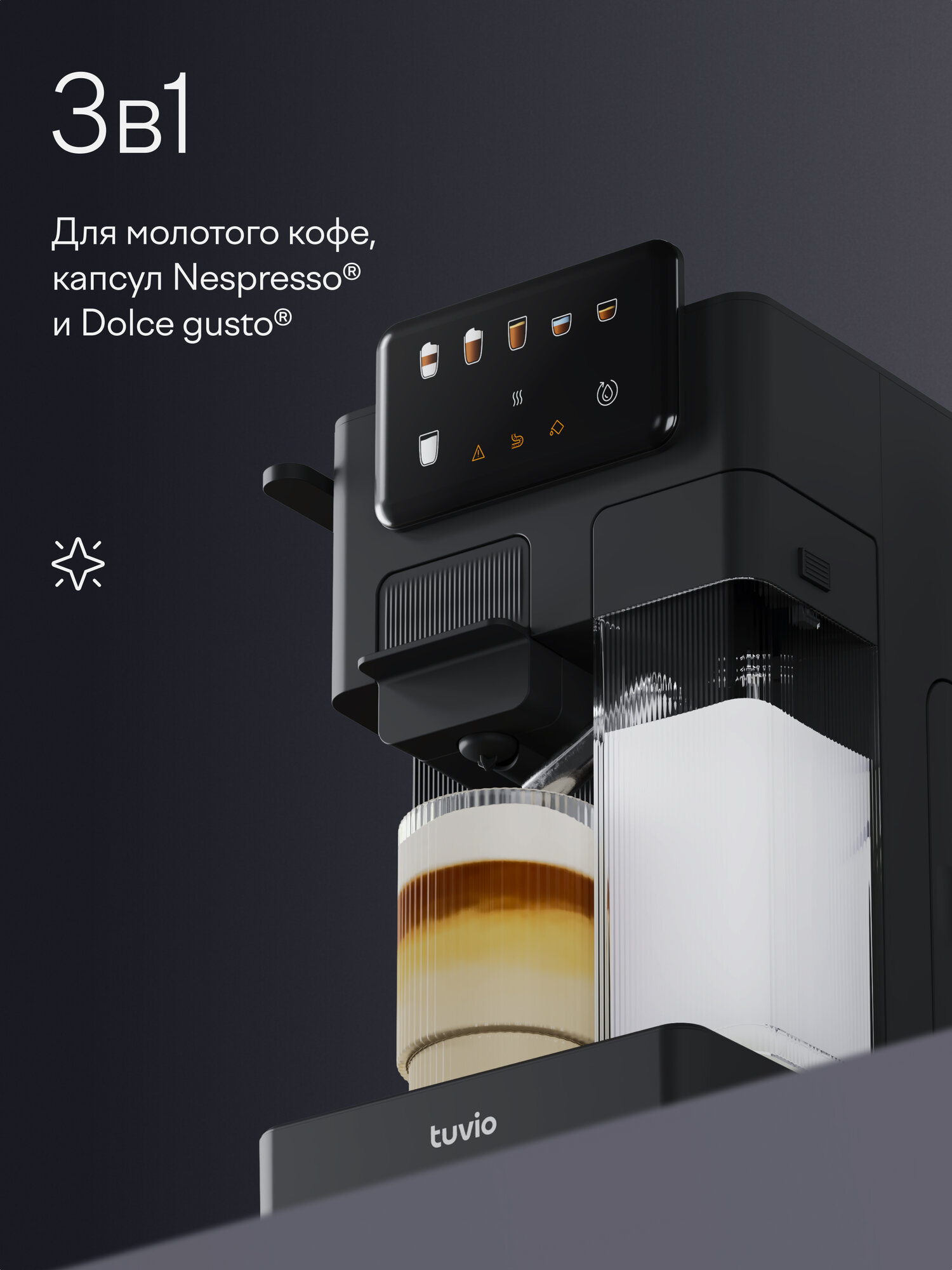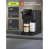 Tuvio — это бренд удобной бытовой техники, придуманный в Яндекс Фабрике. ㅤ Кофеварка Tuvio TCM11EA — это компактное 3-в-1 устройство для приготовления молотого и капсульного кофе. Подходит для капсул Nespresso® и Dolce Gusto® — можно выбрать привычный формат и готовить разные напитки дома. ㅤ Давление помпы — 20 бар. Оно помогает раскрыть вкус эспрессо и лунго. Для кофейных напитков с молоком подойдут два варианта: ручной капучинатор для более плотной пены и авто-капучинатор для быстрого и равномерного взбивания. Объём контейнера для молока — 350 мл. Чтобы пена получилась густой, рекомендуется использовать молоко жирностью от 3% и температурой 4–6°. ㅤ Сенсорное управление помогает выбрать формат напитка и настроить процесс одним касанием. Резервуар для воды объёмом 1,7 л подойдёт для нескольких приготовлений подряд. Эргономичный корпус компактно помещается на кухне и легко вписывается в пространство. Nespresso®, Dolce Gusto® являются зарегистрированными товарными знаками компании Société des Produits Nestlé S.A. (Сосьете Де Продюи Нестле С. А.). Производитель кофеварки и/или продавец не связан с правообладателем и размещает информацию исключительно с целью указания совместимого формата капсул.