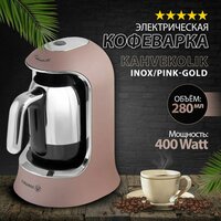 Электрическая кофеварка от турецкого производителя Коркмаз (Korkmaz) Kahvekolik компактная, удобная, простая в эксплуатации - идеальный выбор для любителей кофе по-Турецки. Изготовлена из высококачественной нержавеющей стали и пластика. Мощность кофеварки 400 Watt, объём 280 мл. Термодатчик защиты от работы без воды и высоких температур. Автоматическое выключение по готовности кофе. Кофеварка подает 3 звуковых сигнала о готовности кофе. После 4-го сигнала выключается автоматически. Производит до четырех чашек турецкого кофе за один раз.