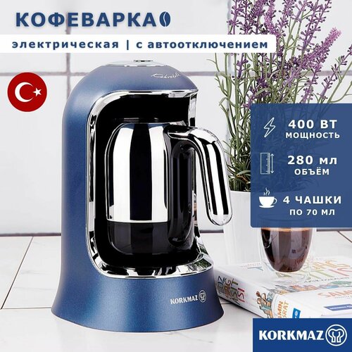 Электрическая кофеварка от турецкого производителя Коркмаз (Korkmaz) Kahvekolik компактная, удобная, простая в эксплуатации - идеальный выбор для любителей кофе по-Турецки. Изготовлена из высококачественной нержавеющей стали и пластика. Мощность кофеварки 400 Watt, объём 280 мл. Термодатчик защиты от работы без воды и высоких температур. Автоматическое выключение по готовности кофе. Кофеварка подает 3 звуковых сигнала о готовности кофе. После 4-го сигнала выключается автоматически. Производит до четырех чашек турецкого кофе за один раз.