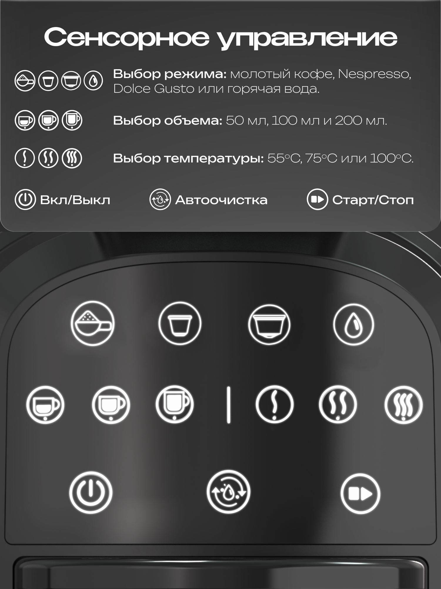 Панель управления: · Приготовление кофе: кнопка «Молотый кофе», кнопка «Капсула Nespresso», кнопка «Капсула Dolce Gusto», кнопка «Горячая вода»; · Выбор объема напитка: кнопка «Маленькая чашка», кнопка «Средняя чашка», кнопка «Большая чашка»; · Температура напитка: кнопка «Низкая температура», кнопка «Средняя температура», кнопка «Высокая температура»; · Дополнительно: кнопка «Вкл/Выкл», кнопка «Автоочистка», кнопка «Страт/Стоп». Комплектация: Капсульная кофеварка; Контейнер для молотого кофе на одну чашку; Контейнер для молотого кофе на две чашки; Ложка-пресс для кофе; Адаптер для капсул Dolce Gusto; Адаптер для капсул Nespresso; Адаптер для молотого кофе; Руководство пользователя; Транспортировочная коробка + подарочная коробка.