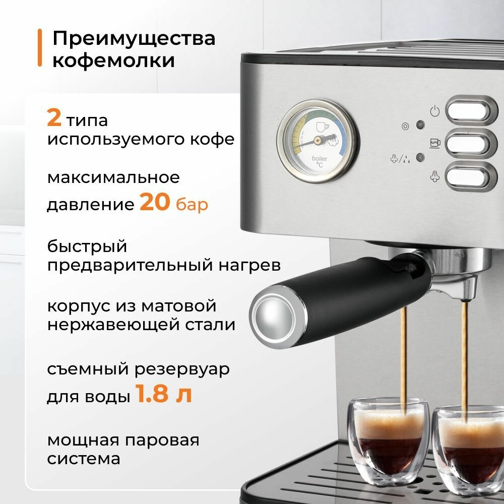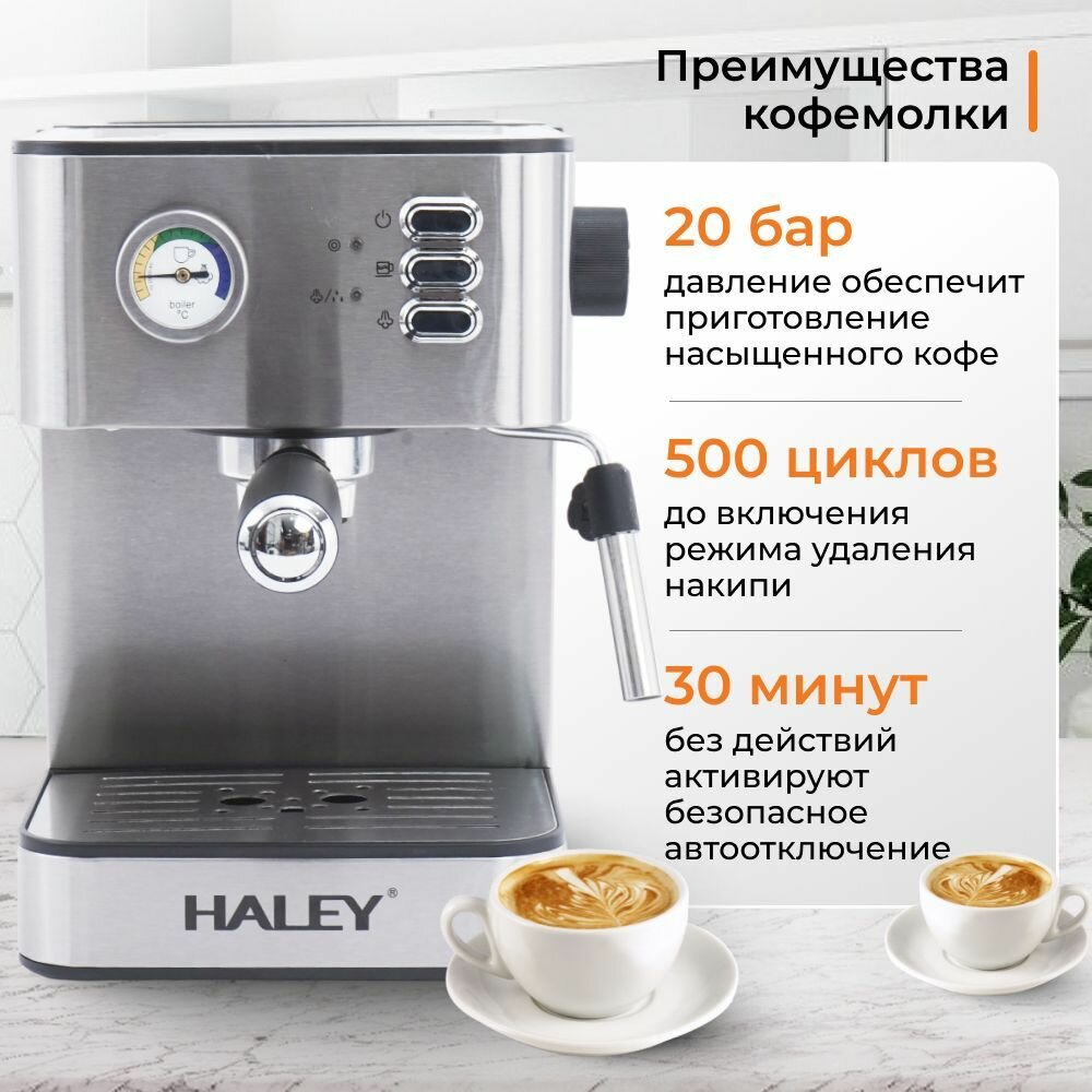 Кофеварка рожковая HALEY-2801, с капучинатором автоматическое, нержавеющем стальном, встроенный манометр 20 Bar,1,8 литра ,850 Вт, автоподогрев: сравнение цен, характеристики, фото, актуальное наличие и цены.