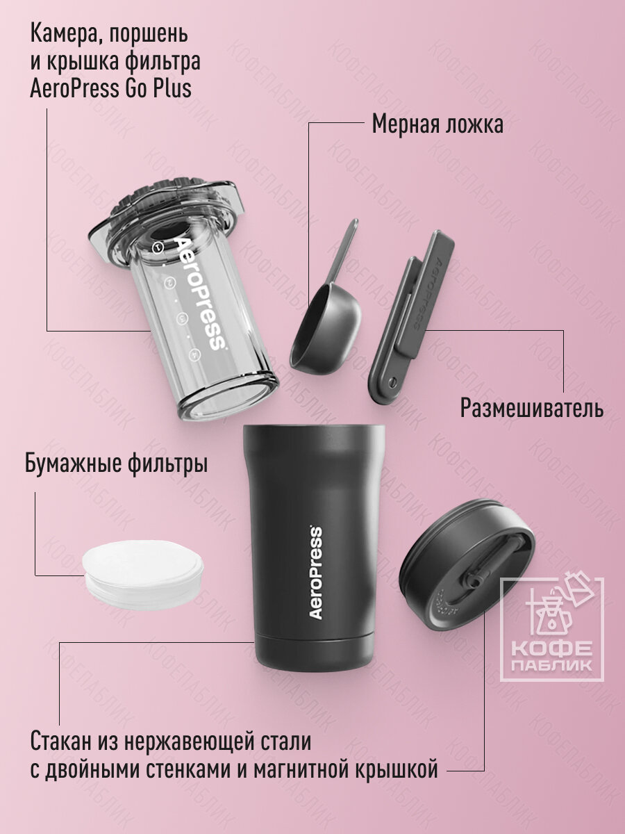 Кофеварка ручная AeroPress Go Plus - это идеальное решение для любителей качественного кофе в дороге, изготовленное из современного, прочного и небьющегося материала Tritan*, с термостаканом для кофе из нержавеющей стали.