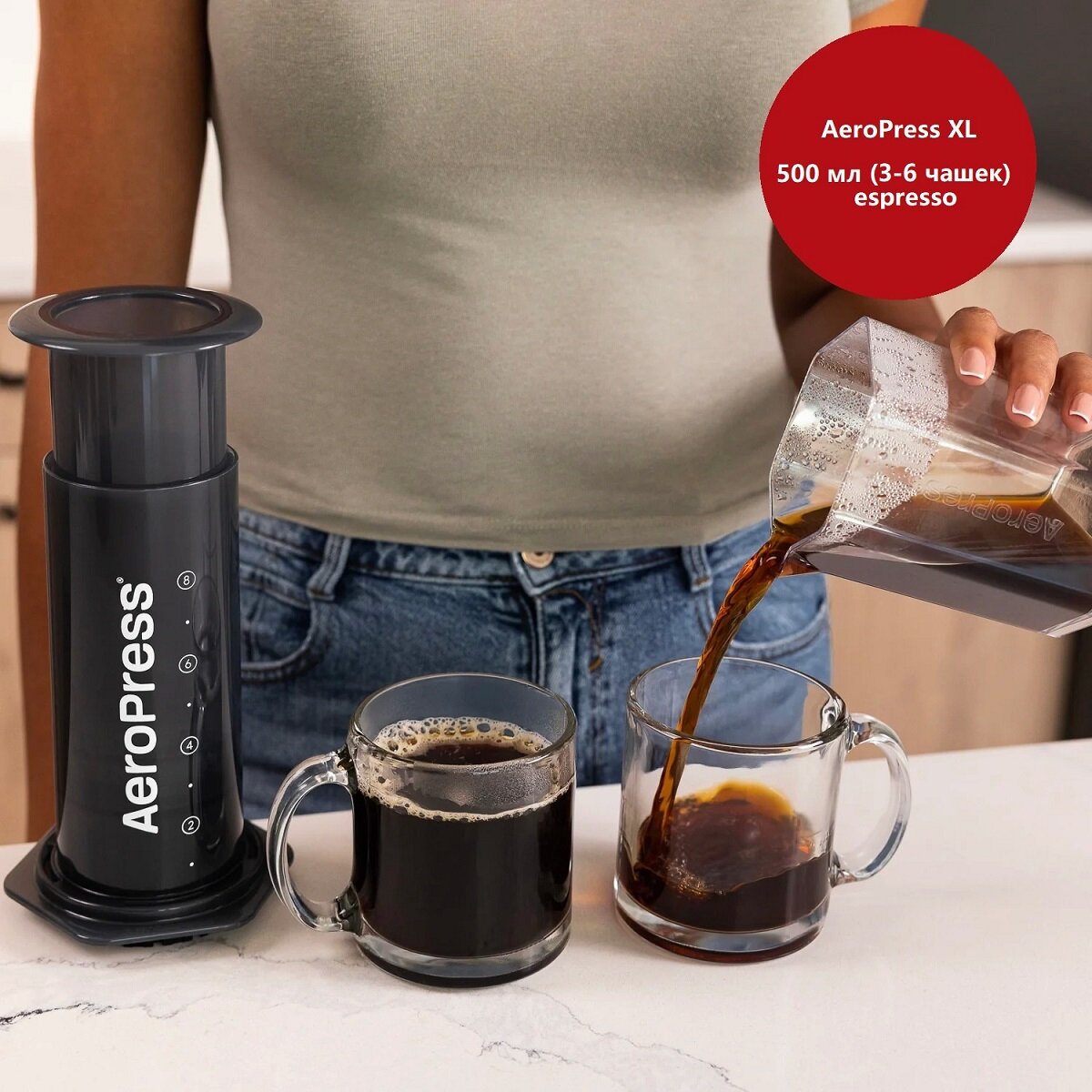 Ручная кофеварка Аэропресс XL (AeroPress XL) - тот же самый легендарный AeroPress Original изготовленный по запатентованной технологии, только в удвоенной производительности - на объём 500 мл. и с прозрачным ударопрочным стаканом-графином, сделанным из Tritan Tm. Версия XL позволяет за один цикл приготовить кофе на компанию в 2-3 человека.