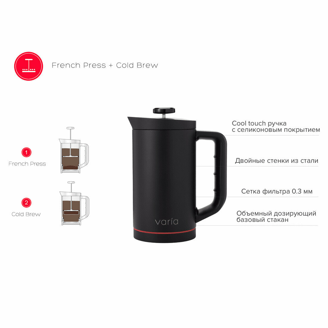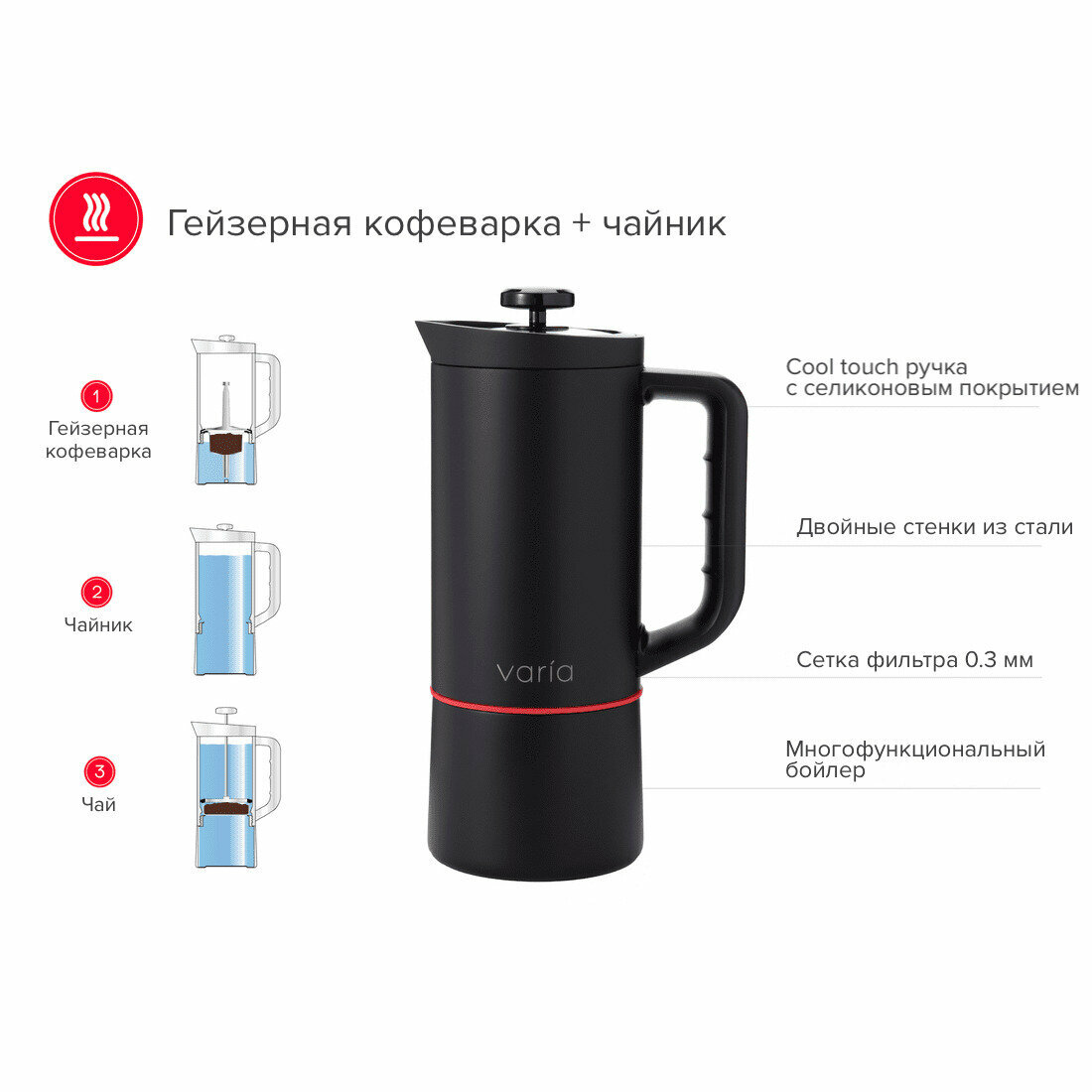 - Кофеварка Varia Multi Brewer чёрного цвета (кувшин, бойлер, основание, крышка, плунжер, камера/фильтр для гейзерного способа варки);
