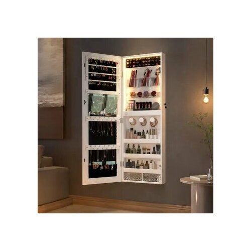 Описание продукта: этот зеркальный шкаф сосредоточен на функциях зеркала для одежды, хранения ювелирных изделий и хранения косметики, а внутри добавлена светодиодная лента, чтобы сделать весь зеркальный шкаф более красивым и практичным. Зеркальный шкаф может быть повешен на стене или на двери, что экономит пространство, имеет высокую практичность и оснащен простым замком, чтобы дети не открывали его по ошибке. e
