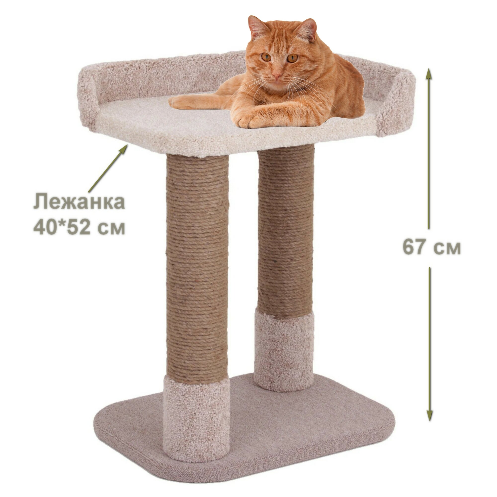 Когтеточка оборудована двусторонней лежанка, что позволяет кошке точить когти с двух сторон. Лежанка имеет размеры 40х52 см, что обеспечивает комфортное пространство для отдыха вашего питомца.