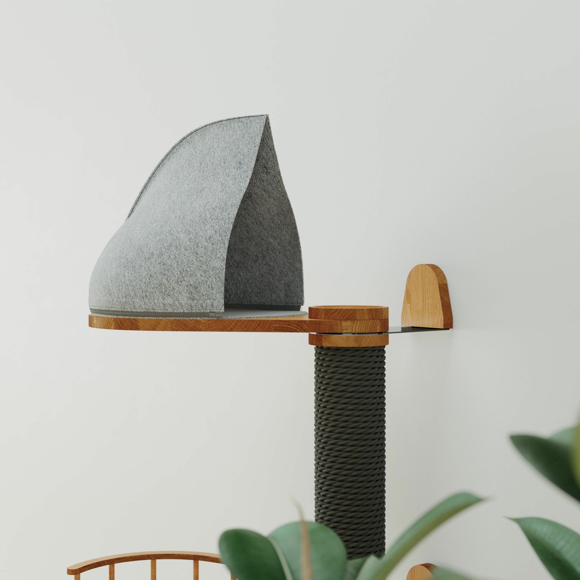 Когтеточка для кошек. Комплекс Catsby WALL изготовлен из натурального дуба и хлопкового каната, крепится к стене, не занимает место на полу, облегчает уборку, бережёт мизинцы. Высота 120 см, это высота до верхней полки не считая высоту домика.