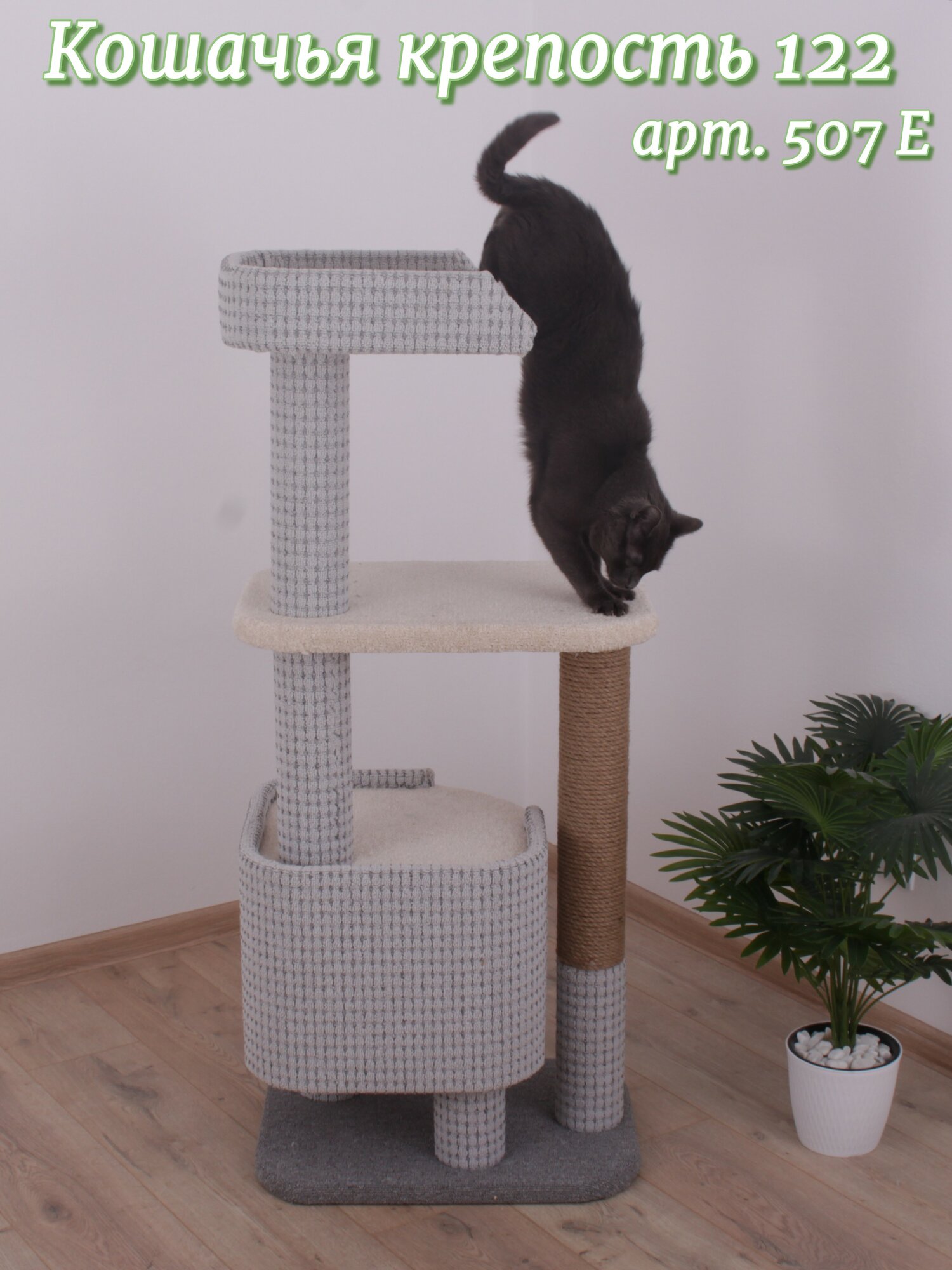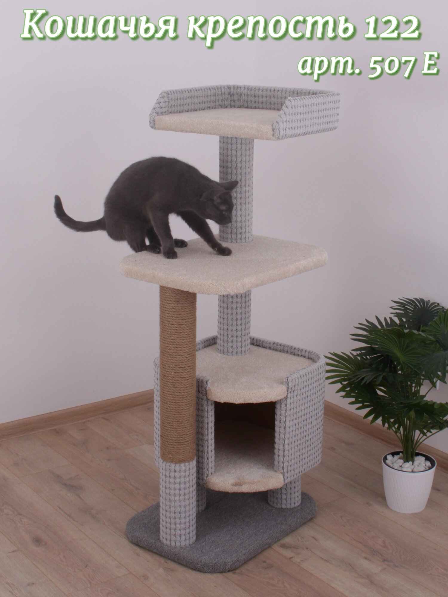 Особенностью комплекса является его многофункциональность. В нем предусмотрены: 2 полноценные лежанки, размерами 52 х 40 см и 42 х 40 см; домик размером 40 х 40 х 32 см, ширина входа в домик 17 см, размер лежанки на крыше домика 40 х 40 см, домик приподнят над полом на 17 см; полноценная когтеточка, диаметр 11 см, верхняя точка когтеточки расположена на высоте 77 см от пола, что позволяет кошке вытянутся во весь рост и точить когти. Джутовая веревка плотно приклеена к столбу и будет долго выполнять роль когтеточки.
