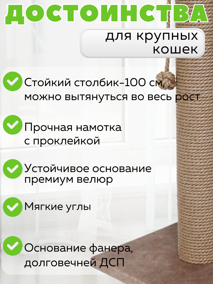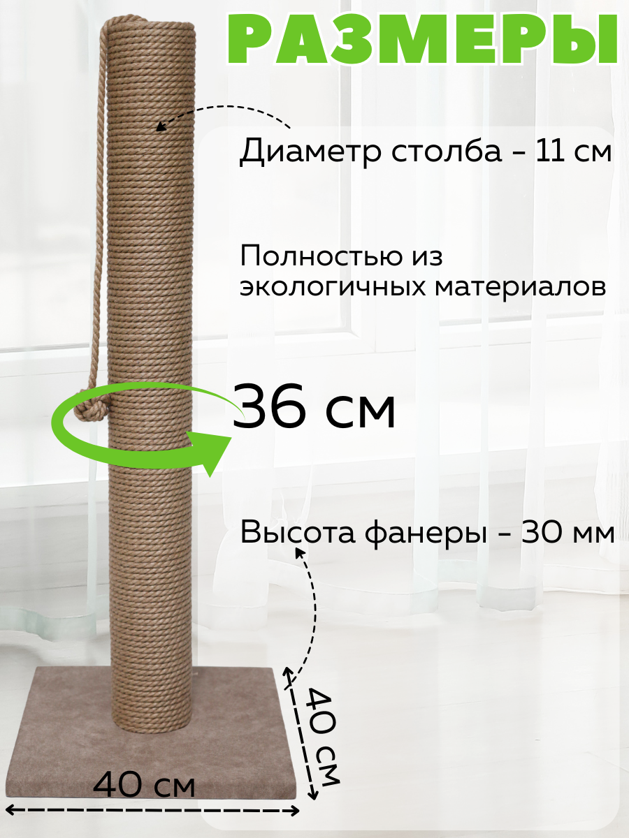 Этот напольный столбик создаст настоящий вертикальный кошачий комплекс для вашего питомца. Подходит для больших и крупных котов, также идеально подходит для мей кунов. Изготовлен из джутового каната с натуральным хлопковым волокном, этот товар обеспечит надежную защиту ваших мебели и ковров от острых коготков. Высота позволяет котенкам также наслаждаться игрой и тренировкой своих навыков. Ваш кот сможет по достоинству оценить не только функциональность, но и привлекательность этой игрушки когтедралка, если добавить кошачью мяту. Столбик значительно увеличит пространство для игр, точить когти для кошек, что будет особенно полезно для активных пород. Материалы полностью безопасны и экологичны, конструкция продумана до мелочей, чтобы обеспечить устойчивость и долговечность товара. Ваш мейн кун получит занятие на долгие часы, лучшая игрушка для кота, столб для кота, укрепляя свои когти о прочный джутовый канат, подходит для двух котов. Запасные сменные столбы в наличии. Легко впишется в интерьер вашего дома благодаря своему лаконичному дизайну и станет любимым местом вашего пушистого друга. Высокая поверхность позволяет реализовать все потребности животного в движении и расслаблении. Не сомневайтесь, ваш кот оценит внимание производителей к деталям: от прочного основания до полноценной высоты конструкции. Мягкие края исключают риск травмирования лапок, а натуральные материалы джут делают когтеточку безвредной как для взрослых кошек, так и для маленьких котят cat. Подходящее решение как для любопытных животных, которые любят исследовать пространство вокруг себя, так и для спокойных представителей рода кошачьих — всех объединяет тяга к комфорту и удовольствие от хорошо продуманной игрушки. Игрушка для котенка. Вас порадует неприхотливость в уходе аксессуары для кошек: достаточно лишь слегка пройтись влажной тряпкой по поверхности после активных игр вашего любимца. Не упускайте возможность сделать каждый день вашего питомца насыщенным новым опытом с зоотоварами для кошек!