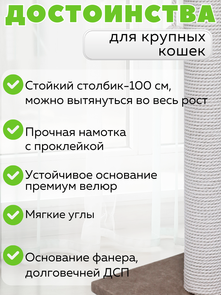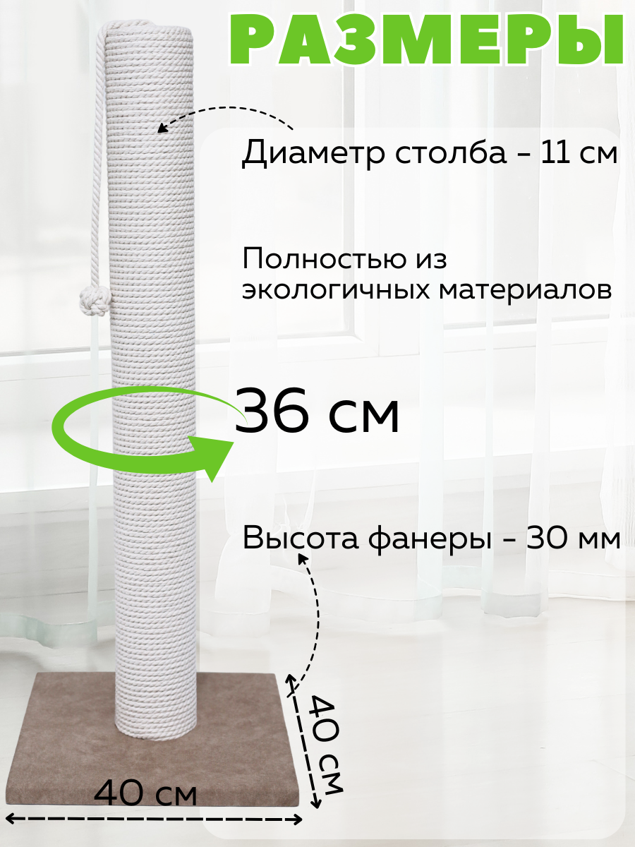 Этот напольный столбик создаст настоящий вертикальный кошачий комплекс для вашего питомца. Подходит для больших и крупных котов, также идеально подходит для мей кунов. Изготовлен из джутового каната с натуральным хлопковым волокном, этот товар обеспечит надежную защиту ваших мебели и ковров от острых коготков. Высота позволяет котенкам также наслаждаться игрой и тренировкой своих навыков. Ваш кот сможет по достоинству оценить не только функциональность, но и привлекательность этой игрушки когтедралка, если добавить кошачью мяту. Столбик значительно увеличит пространство для игр, точить когти для кошек, что будет особенно полезно для активных пород. Материалы полностью безопасны и экологичны, конструкция продумана до мелочей, чтобы обеспечить устойчивость и долговечность товара. Ваш мейн кун получит занятие на долгие часы, лучшая игрушка для кота, столб для кота, укрепляя свои когти о прочный джутовый канат, подходит для двух котов. Запасные сменные столбы в наличии. Легко впишется в интерьер вашего дома благодаря своему лаконичному дизайну и станет любимым местом вашего пушистого друга. Высокая поверхность позволяет реализовать все потребности животного в движении и расслаблении. Не сомневайтесь, ваш кот оценит внимание производителей к деталям: от прочного основания до полноценной высоты конструкции. Мягкие края исключают риск травмирования лапок, а натуральные материалы джут делают когтеточку безвредной как для взрослых кошек, так и для маленьких котят cat. Подходящее решение как для любопытных животных, которые любят исследовать пространство вокруг себя, так и для спокойных представителей рода кошачьих — всех объединяет тяга к комфорту и удовольствие от хорошо продуманной игрушки. Игрушка для котенка. Вас порадует неприхотливость в уходе аксессуары для кошек: достаточно лишь слегка пройтись влажной тряпкой по поверхности после активных игр вашего любимца. Не упускайте возможность сделать каждый день вашего питомца насыщенным новым опытом с зоотоварами для кошек!