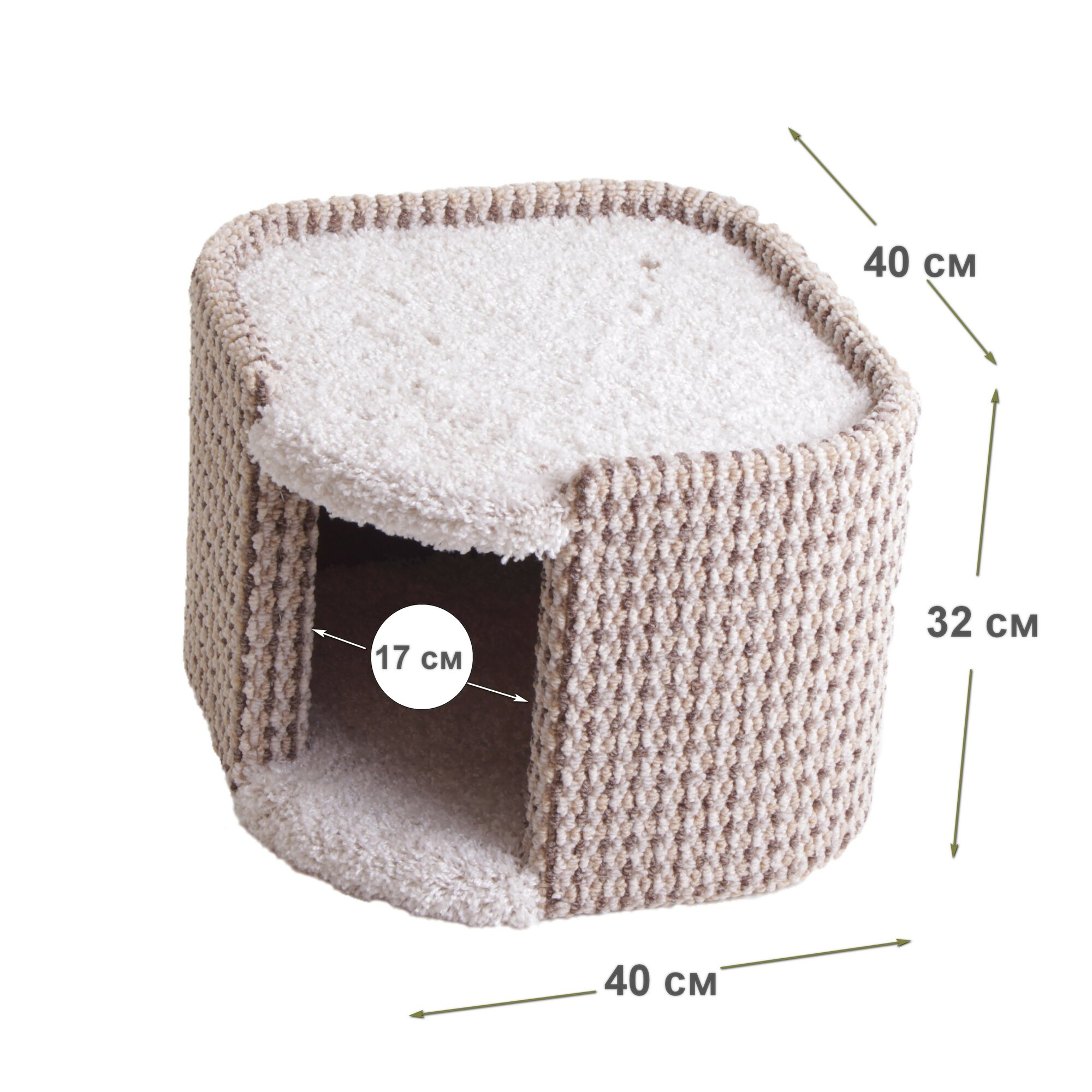 Особенностью комплекса является его многофункциональность. В нем предусмотрены: 2 полноценные лежанки, размерами 52 х 40 см и 42 х 40 см; домик размером 40 х 40 х 32 см, ширина входа в домик 17 см, размер лежанки на крыше домика 40 х 40 см, домик приподнят над полом на 17 см; полноценная когтеточка, диаметр 11 см, верхняя точка когтеточки расположена на высоте 77 см от пола, что позволяет кошке вытянутся во весь рост и точить когти. Джутовая веревка плотно приклеена к столбу и будет долго выполнять роль когтеточки.