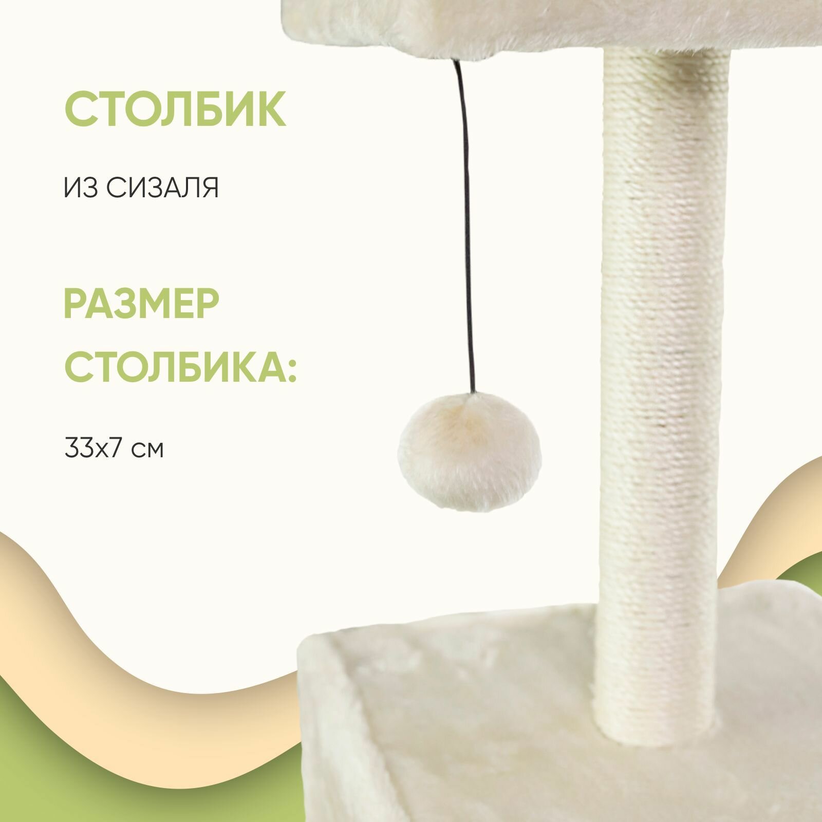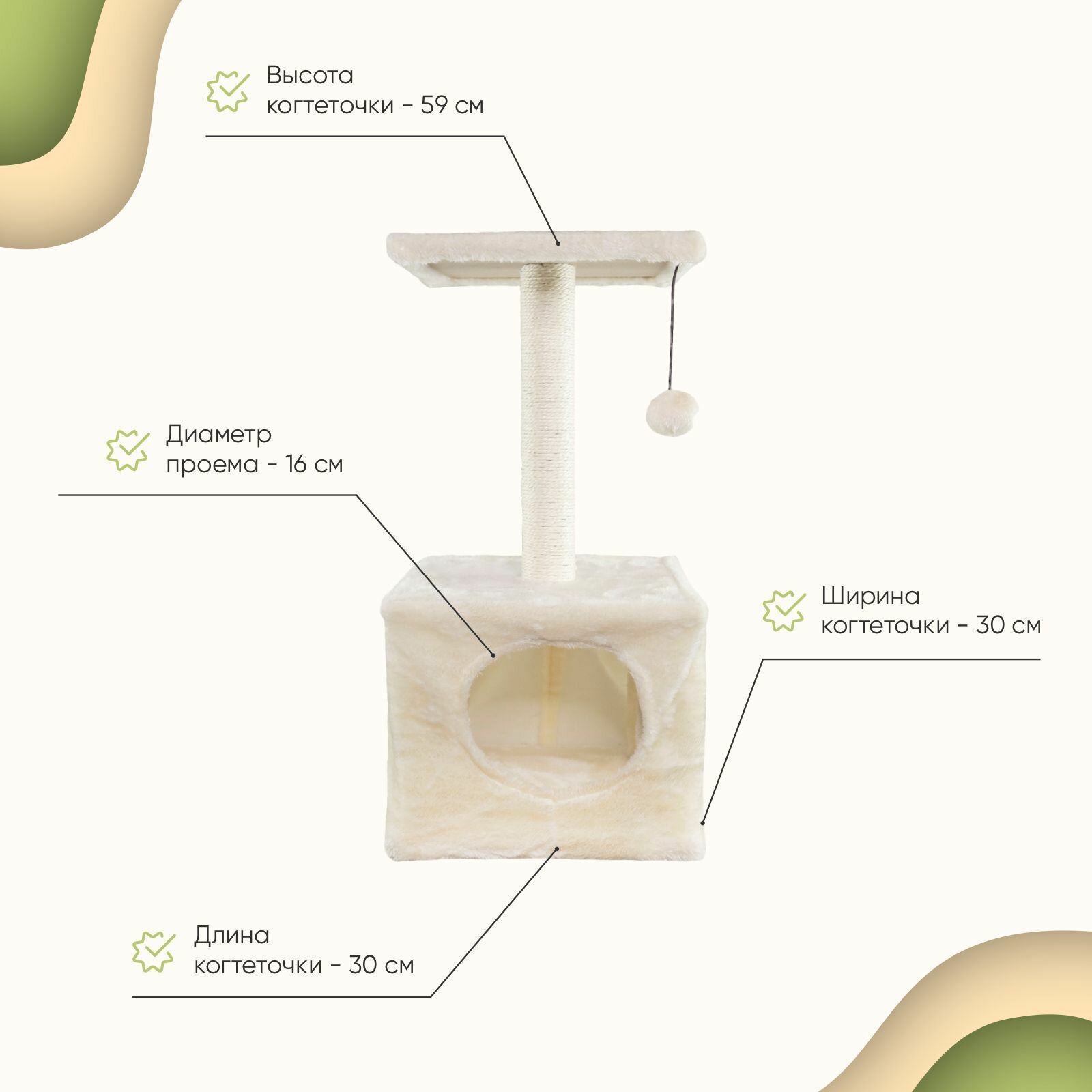 размер платформы - 39,5 х 39.5 х 1.2 см, размер нижней лежанки - 39.5 х 39.5 х1.2 см, размер средней лежанки - 31 х 31 х 9 см, размер верхней лежанки - 39.5 х 24.5 х 1.2 см, размер столбика с игрушками - 50 х 5 см, высота собранного домика - 125 см