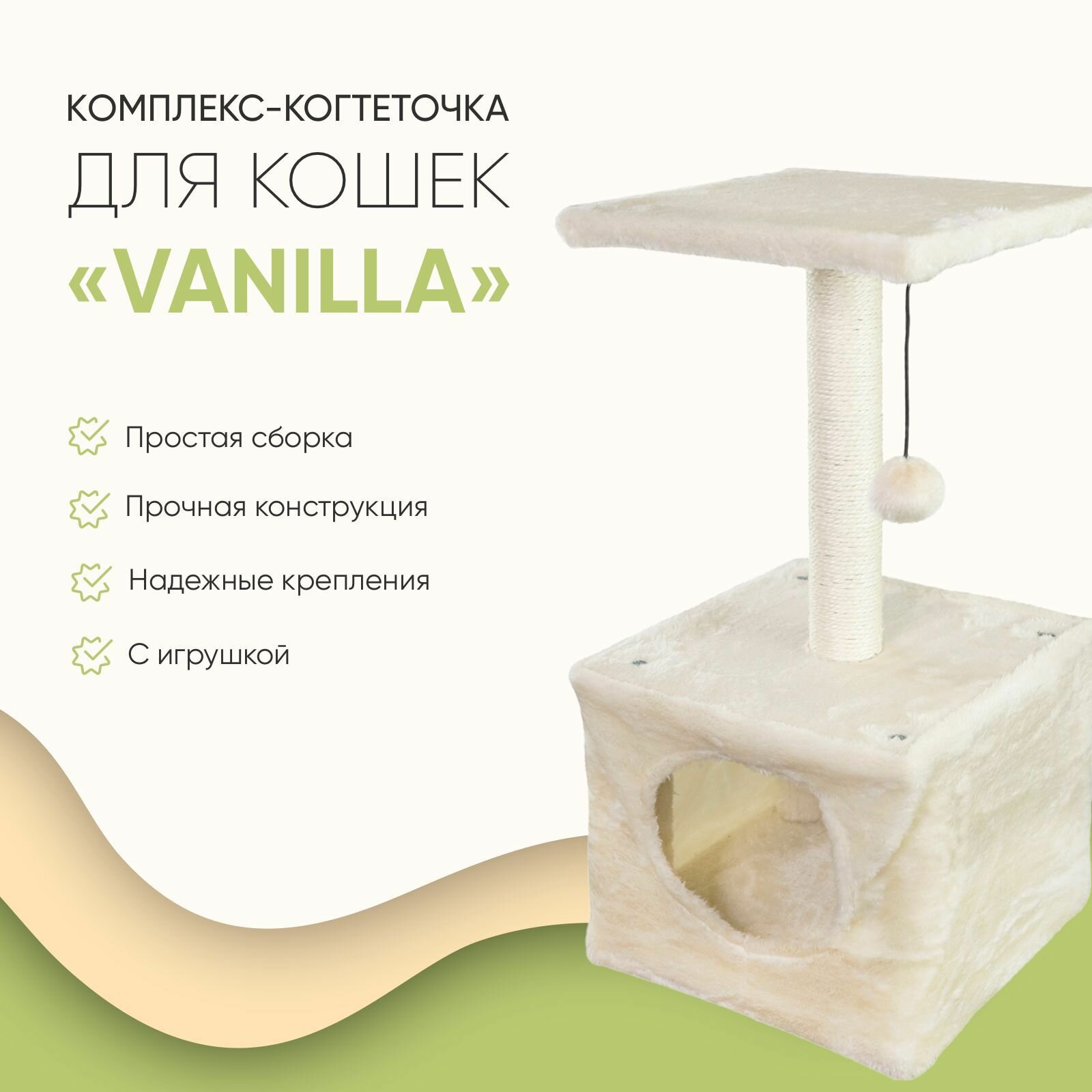 О товаре Когтеточка-комплекс для кошек Не Один Дома Vanilla 30*30*59см - компактная и уютная игровая площадка с двумя спальными местами для вашего пушистого любимца! Комплекс сделан из ДСП, покрытого мягкой приятной тканью, устойчивой к когтям. Столбик обтянут джутовой веревкой, что делает его привлекательным для точения когтей. К верхнему этажу подвешена игрушка на веревочке, чтобы вашему питомцу не пришлось скучать. Прочная и устойчивая конструкция позволяет избежать опрокидывания. Комплекс «Vanilla» рассчитан на одну или двух кошек весом до 5-6 кг. Рекомендуется очищать от шерсти специальной щеткой или влажной салфеткой.