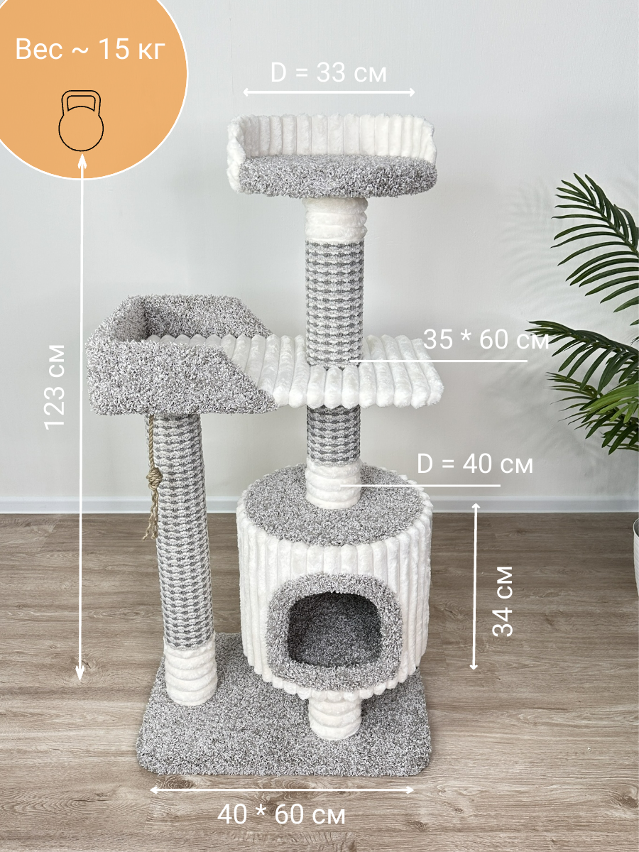 Когтеточка «Котосчастье» с домиком и лежаком из ковролина, серый, молочный
