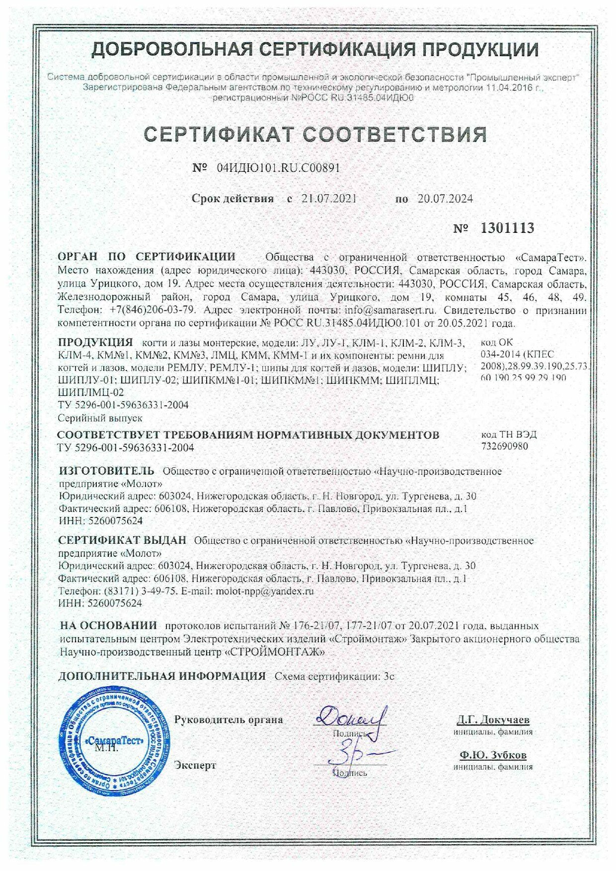 Четвертый дополнительный ремень поддерживает ступню со стороны пяты, прижимая ее к основанию когтя во время вытаскивания из опоры. Раствор когтя составляет 315 ± 5 мм. Испытательно-эксплуатационная нагрузка составляет 180 кгс на 1 лаз. Диаметр опор от т 220 до 315 мм.