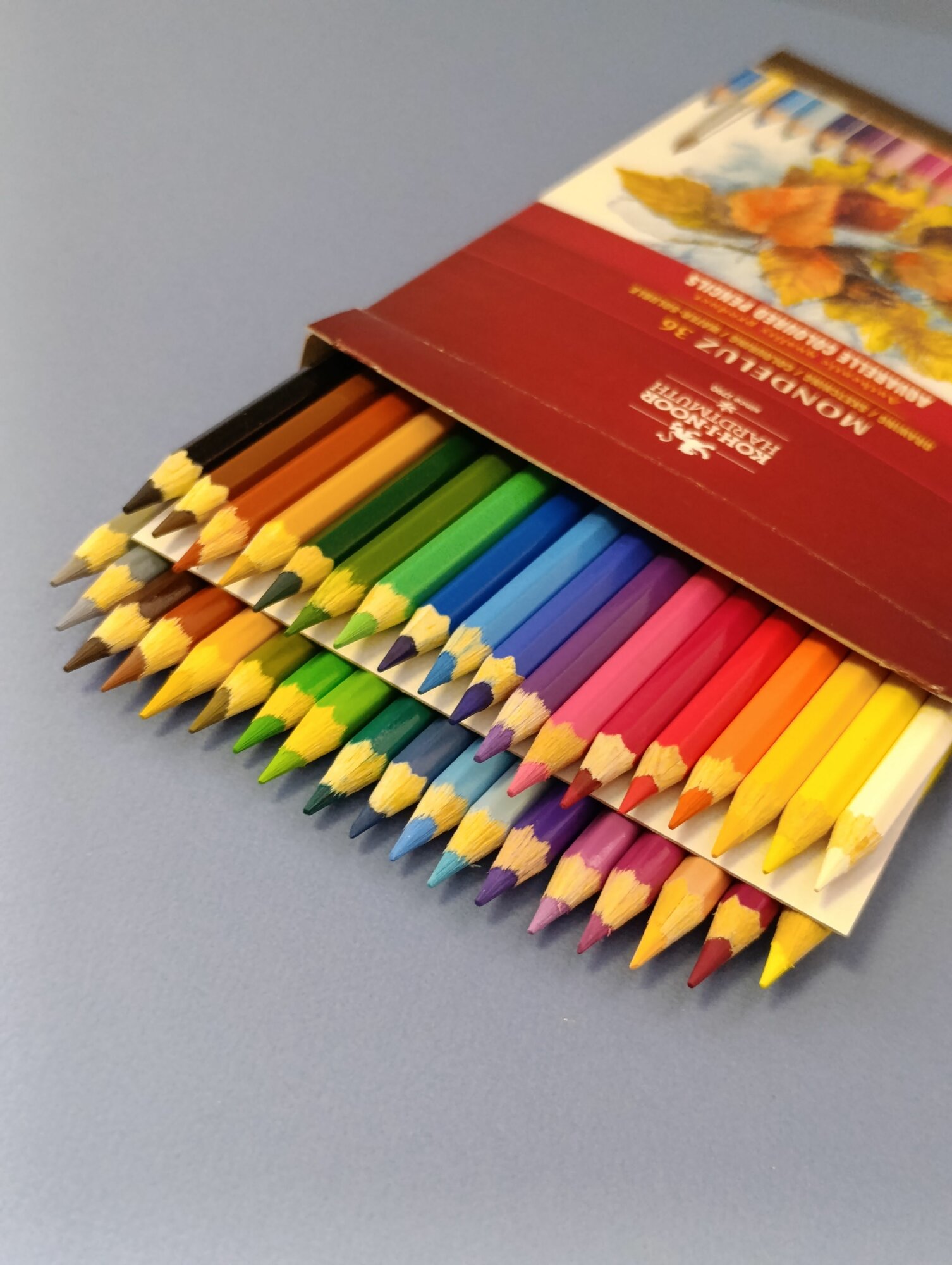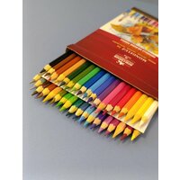Набор из 36 художественных акварельных заточенных карандашей 'Mondeluz' от чешской компании 'Koh-I-Noor'. Это высококачественные профессиональные цветные акварельные карандаши, обеспечивающие четкую передачу цветов и линий. После воздействия на штрихи мокрой кистью, следы карандашей превращаются в акварель с хорошей разносимостью.