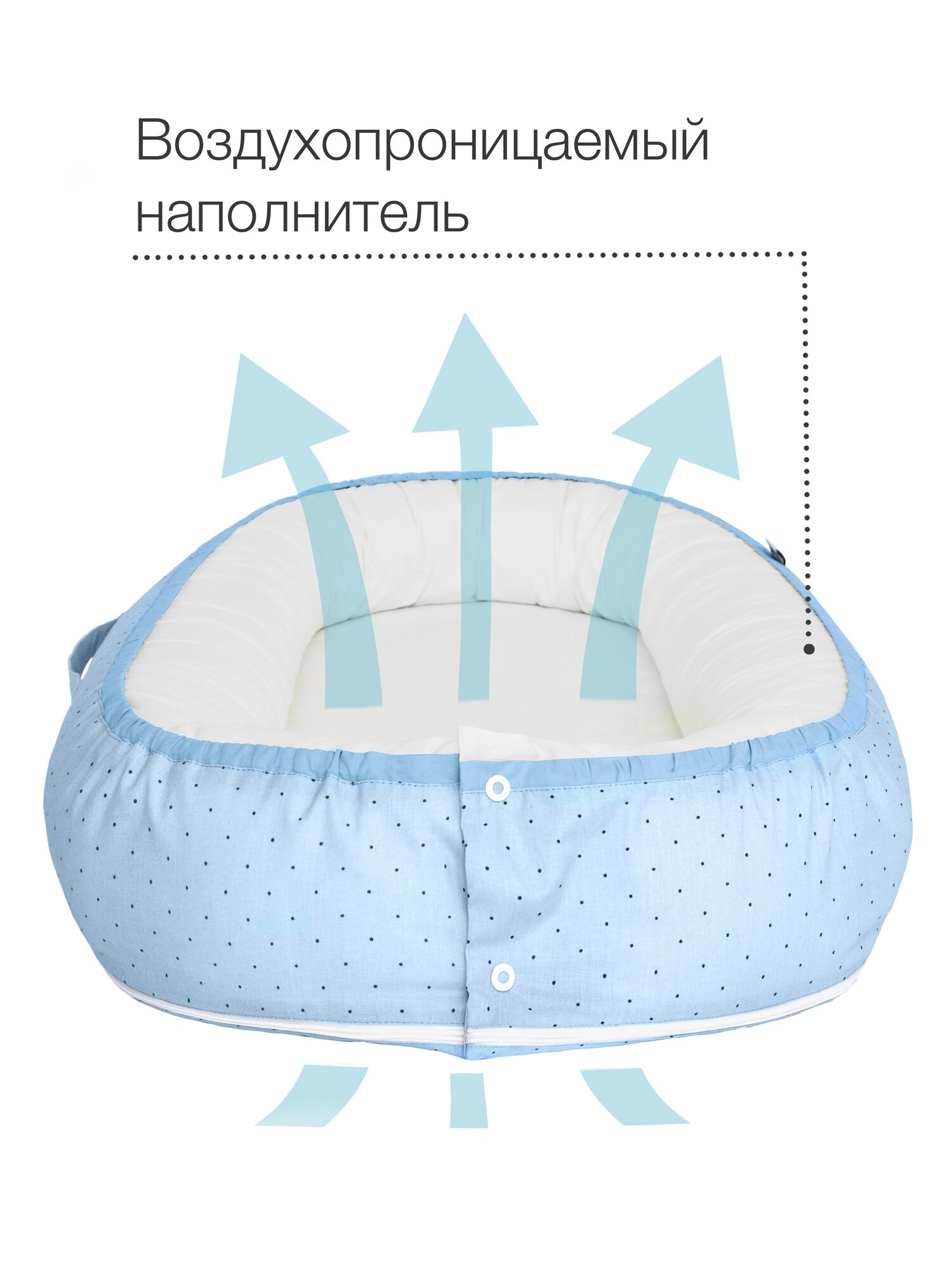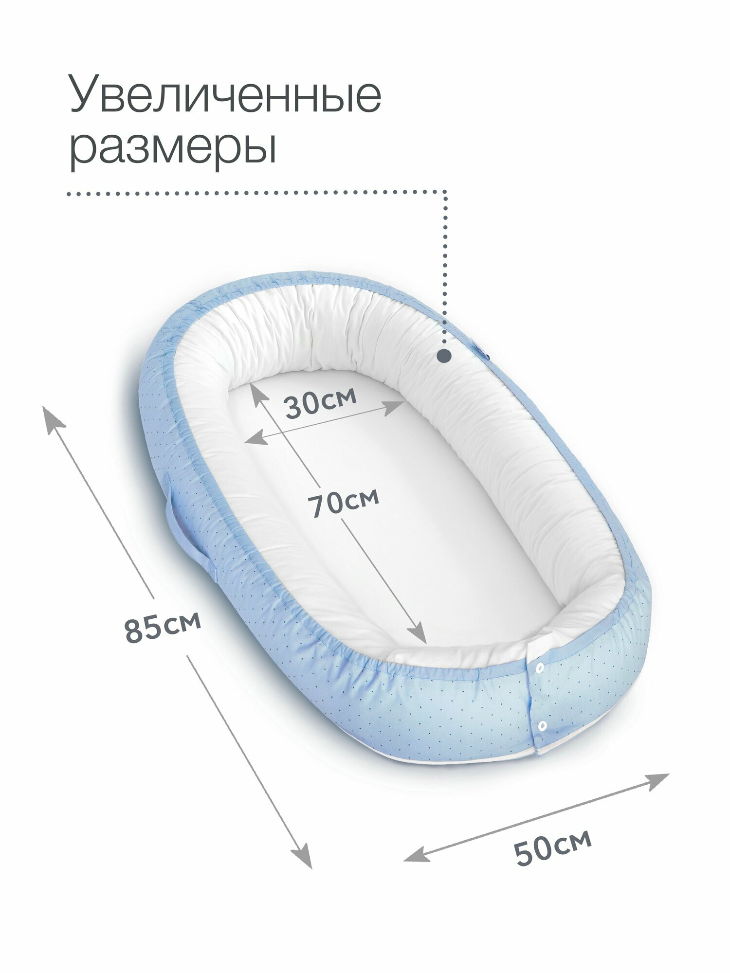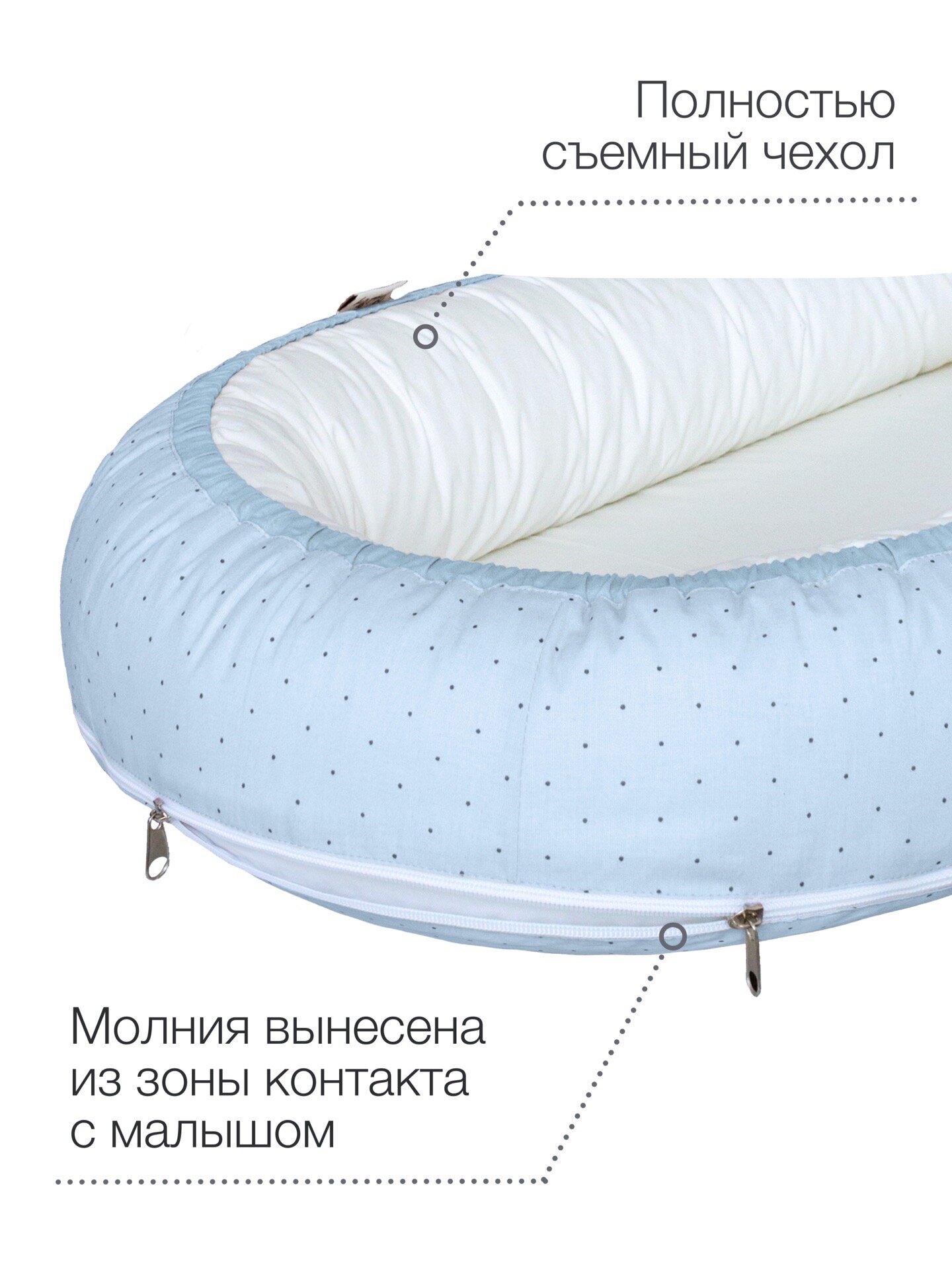 Материал 100% натуральный хлопок поплин. Чехол кокона съемный на молнии. Размеры кокона: внешние 85х50, внутренние 70х30 см, толщина матрасика 3 см, высота бортиков 12 см, в комплекте с коконом идет подушечка. Кокон для новорожденных приходит в подарочном брендированном чехле.