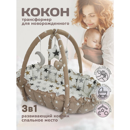 Позиционер поможет адаптироваться вашему малышу к новой жизни, создаст для него условия уютного ограниченного пространства, как у мамы в животике, что снизит стресс новорожденного и колыбелька поможет продлить его сон. Кокон позволит чувствовать малышу себя максимально защищено и комфортно. Позиционер изготовлен из 100% хлопка приглушенных тонов с наполнителем бортиков и матраса из гипоаллергенного холлофайбера, спальное место 30х70 см, раскладывается в игровой коврик, высота бортиков 23 см. Люлька для новорожденного отличный вариант для безопасного сна малыша: как дома, так и в поездках, сохранит спокойный и комфортный сон в привычной обстановке. В комплект кокона – трансформера входят съемные дуги и игрушки, которые позволят развивать внимание, наблюдательность и стимулируют хватательный рефлекс. Прекрасный подарок на рождение ребенка.