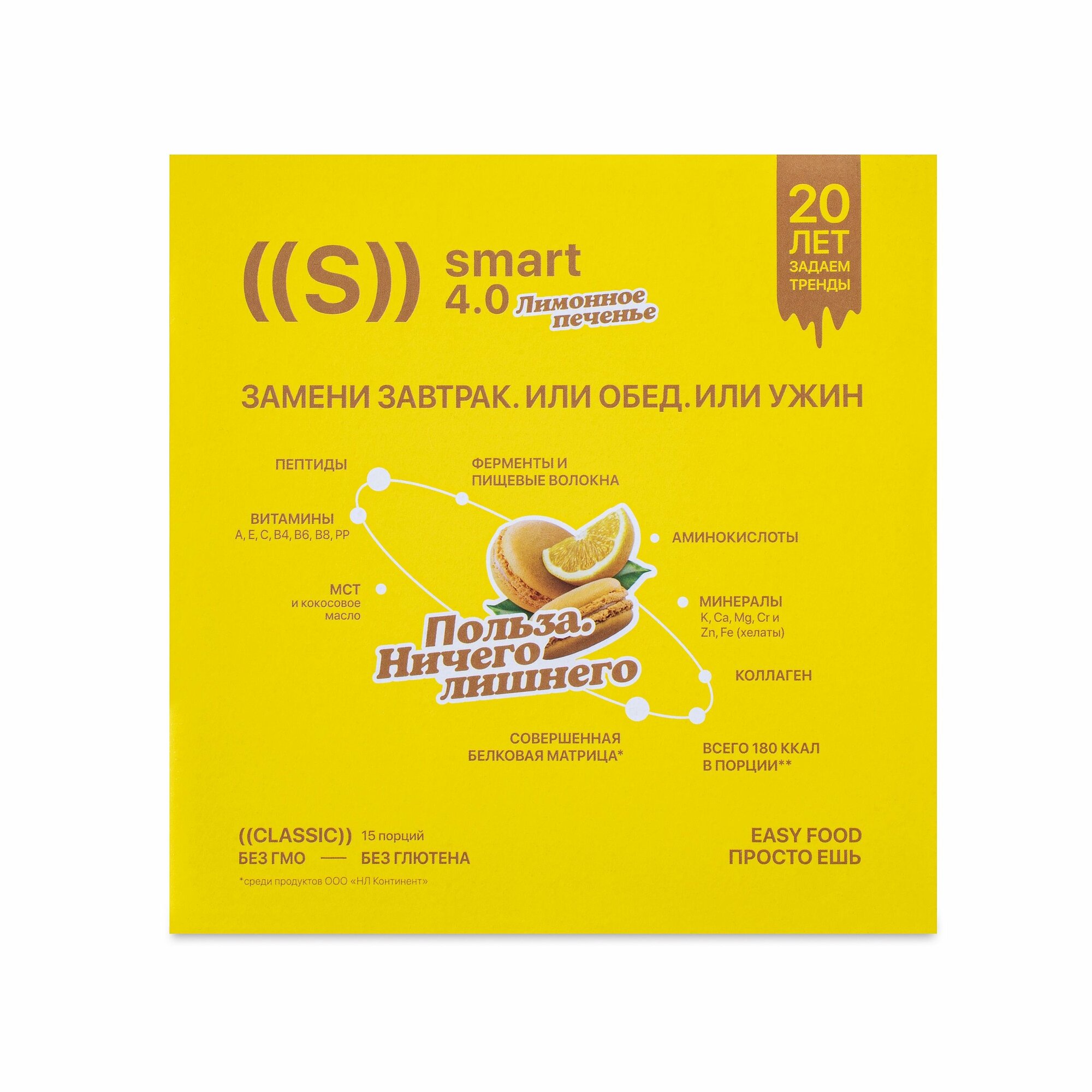 Коктейль со вкусом лимонного десерта - нежный, воздушный, освежающий. В одном напитке вкус и польза, необходимое при насыщенном ритме жизни. Новая формула поможет получить от еды максимум пользы и удовольствия. Обогащен белками нового поколения с пептидами. Легко усваиваются, быстро действуют. Вписаться в ритм жизни просто! Коктейль со вкусом «Лимонное печенье» станет идеальным дополнением вашего дня или завершением вашего вечера, наполнив их ярким вкусом и максимумом пользы. В состав входит инновационная матрица из 5 видов белка, содержащая биоактивные белки и регуляторные протеины: изолят соевого белка, концентрат молочного белка, коллаген, гидролизат сывороточного белка с пептидами и альфа-лактоальбумином с иммуномодулирующим действием и яичный белок. Совершенная белковая матрица* 5G с активным пептидным комплексом для тех, кто хочет быстрее и эффективнее: включить процессы метаболизма на максимум, ускорить путь к совершенству формы и мышц, повысить усвоение витаминов и минералов. Антистресс-комплекс для защиты от стресса. Содержит инозитол — природный транквилизатор, который обеспечивает: уменьшение тревожности, снятие нервного напряжения, улучшение сна. Когнитивный комплекс для повышения умственной активности. Содержит холин В4, который координирует работу мозга: позволяет развить максимальную скорость мышления, улучшает концентрацию внимания и память, обеспечивает высокую продуктивность. Комплекс для иммунитета содержит активные пептиды с усиленной иммунной защитой, а также обеспечивает: антиэйдж-эффект, антиоксидантную защиту. Бьюти-комплекс содержит пептиды коллагена и витамин С: повышает упругость и эластичность кожи, обеспечивает антиоксидантную защиту кожи, защищает кожу от негативного воздействия окружающей среды.