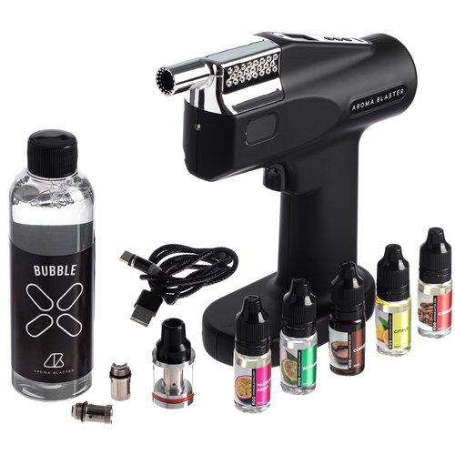 В комплект входит: 1 х бластер Aroma Blaster и USB Type-C кабель для зарядки 1 х арома-магнитный бак (с испарителем) 2 x дополнительных испарителя для магнитного бака 1 х стеклянный цилиндр для магнитного бака 5 х 10 мл флаконов с различными Ароматами 1 х 180 мл бутылочка со специальной Жидкостью для пузырей Bubble X. 1 х год ограниченной гарантии на бластер Aroma Blaster 1 x инструкция