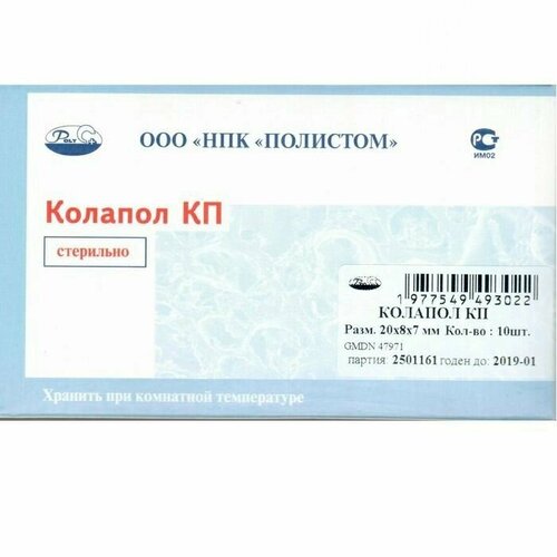 Является композицией органических и неорганических составляющих твердых тканей. Характеризуется биосовместимостью с тканями человека и не вызывает реакции отторжения. Колапол КП усиливает остеогенез (активнее, чем гемостатический колапол КП, но меньше, чем колапол КП-3) и обладает значительным местным гемостатическим действием.
