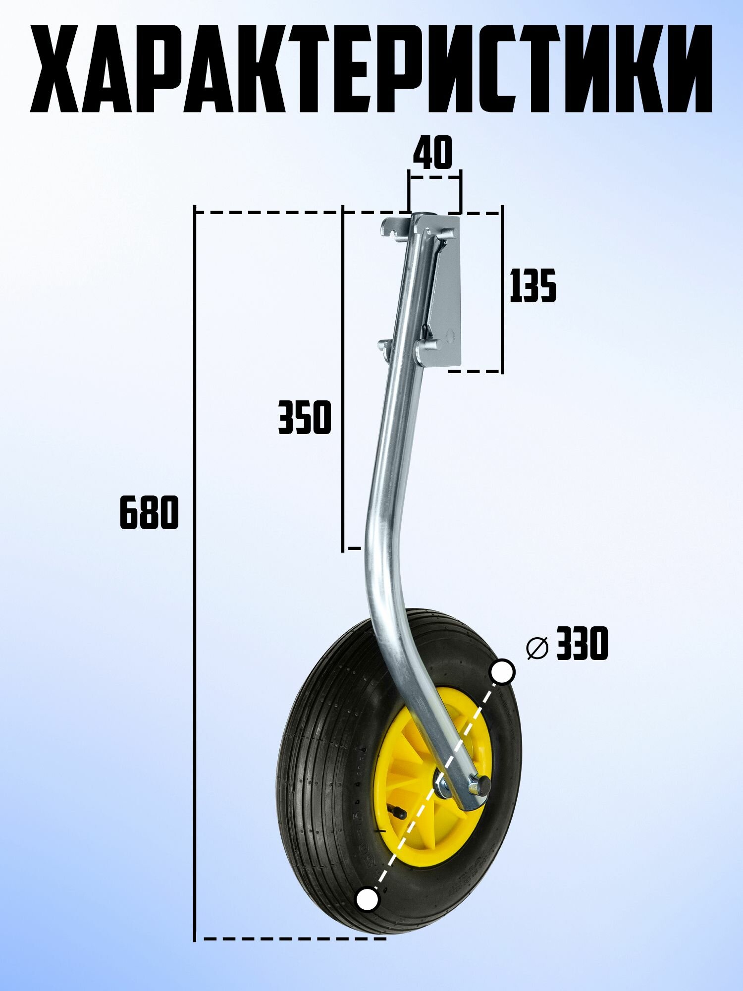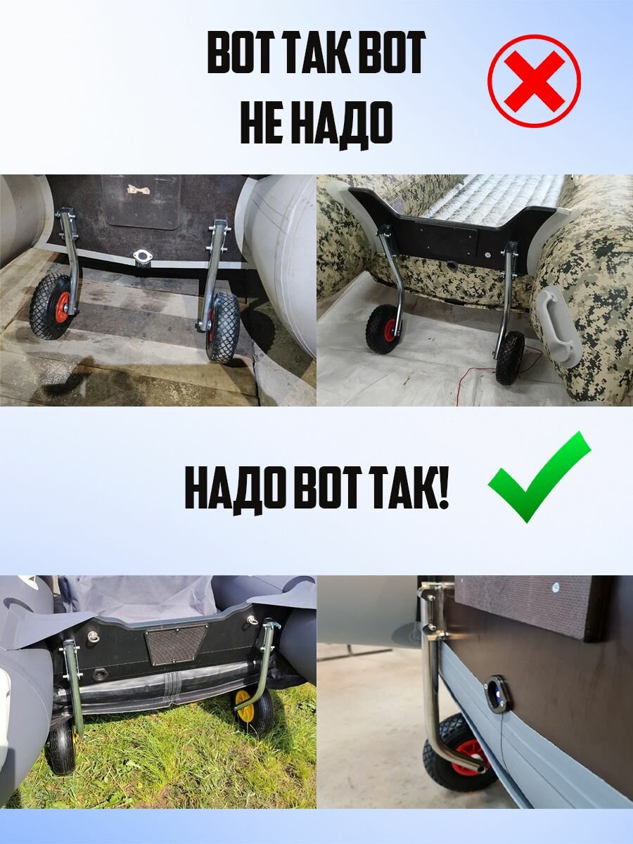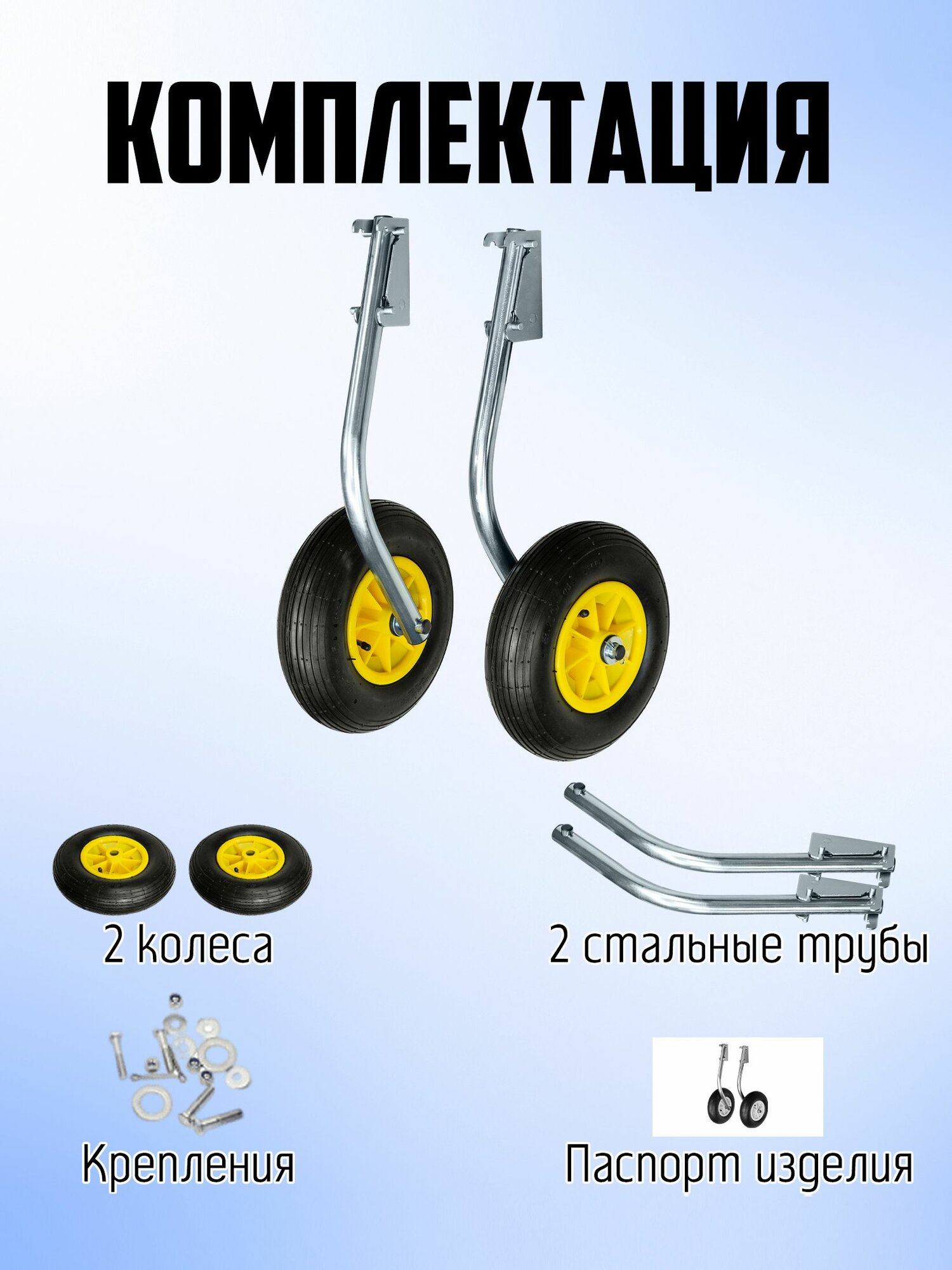 Каркас изготовлен из оцинкованной стали. Транцевые колеса предназначены для ручной транспортировки лодки НДНД. Данный тип колес имеет механизм защёлки, что позволяет легко и удобно снимать и ставить колеса при смене положений. Допустимая нагрузка 150 кг.