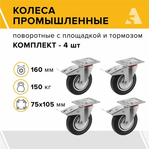 Купить Колеса промышленные SCb 63 поворотные, с площадкой и тормозом, 160 мм, 150 кг, резина, комплект — 4 шт. с доставкой по всей России.
