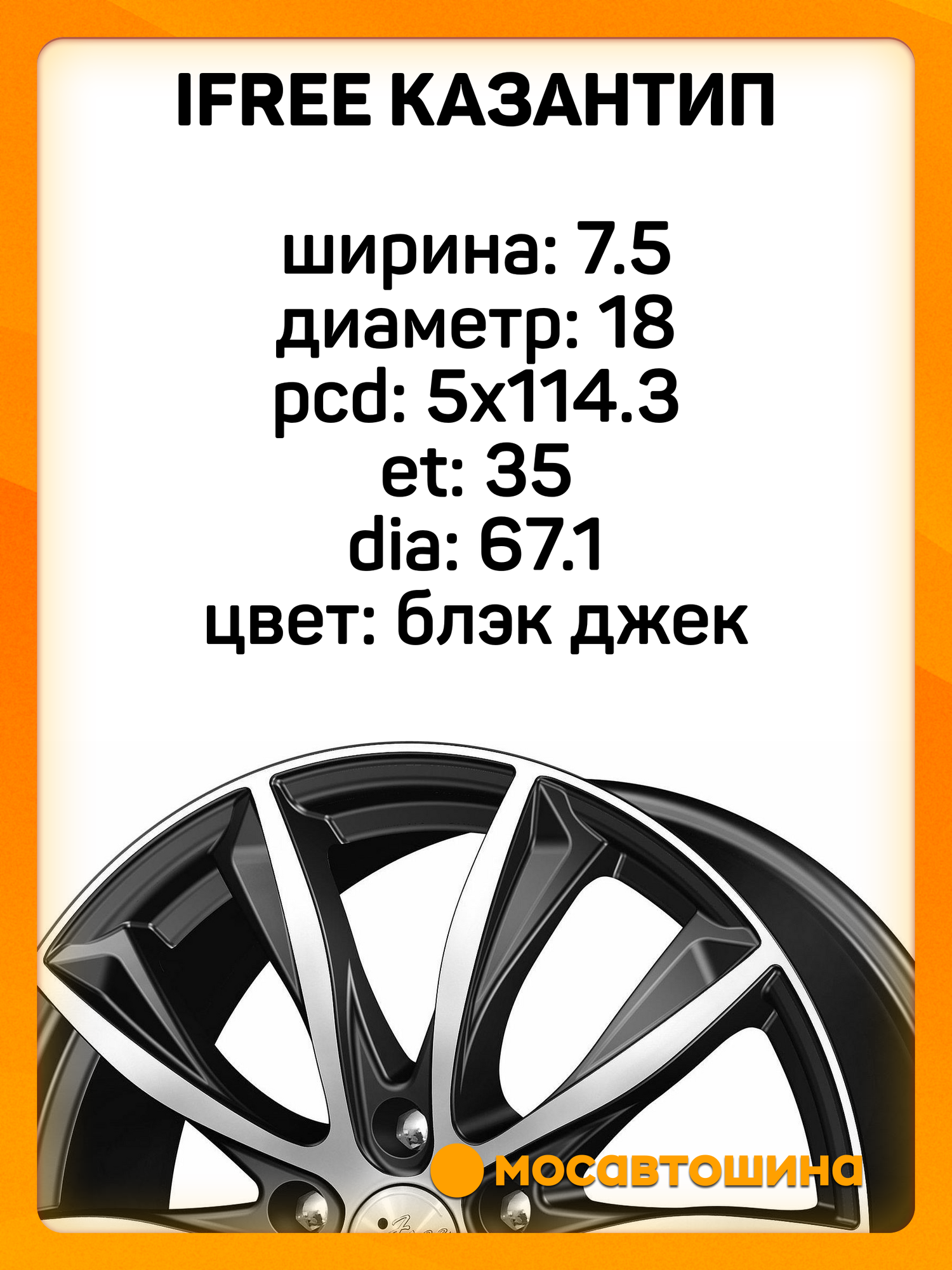 Диск iFree Кazaнтип 7.5x18 5x114,3 ET35 ЦО67.1 цвет bd подходит для Mitsubishi Outlander 2022-2023, Mitsubishi ASX 2017-2023, Infiniti Q45 2002-2006, Toyota Harrier 2003-2006, Lexus NX 2022-2023, Lexus NX 2014-2022, Mitsubishi Outlander 2012-2015, Maserati Ghibli 2013-2022, Kia K9 2022-2023, Lexus RX 2003-2005, Toyota Harrier 2005-2013, Mitsubishi Outlander XL 2010-2012, Hyundai Grandeur 2012-2015, Toyota Venza 2020-2023, Renault Samsung QM6 2020-2023, Toyota Sienna 2010-2016, Lexus RX 2012-2015, Peugeot 4007 2007-2013, Hyundai Genesis 2014-2017, Hyundai Genesis 2008-2011, Citroen C4 2012-2016, Hyundai Genesis 2011-2013, Mitsubishi Outlander XL 2006-2010, Jeep Compass 2006-2010, Mitsubishi Eclipse Cross 2018-2023, Lexus RX 2009-2012, Infiniti M45 2003-2005, Genesis G70 2018-2021, Peugeot 4008 2012-2016, Mitsubishi Delica D:5 2019-2023, Toyota Highlander 2020-2023, Genesis G80 2017-2020, Genesis G70 2022-2023, Haval H2 2014-2020, Ford Freestar 2004-2007, Lexus RX 2006-2009, Genesis G70 2021-2023, Jeep Compass 2011-2013, Kia Stinger 2018-2023, Citroen C-Crosser 2007-2013, Haval Jolion 2021-2023, Toyota RAV 4 2019-2023, Mitsubishi Outlander 2015-2022, Hyundai ix55 2008-2013, Mitsubishi Lancer Evolution 2008-2017, Lifan X70 2018-2023, Kia K900 2019-2022, Changan CS95 2022-2023, Renault Koleos 2017-2020, Toyota Harrier 2020-2023, Toyota Harrier 2003-2013, Ford Freestyle 2005-2007, Jac JS6 2022-2023, Toyota Harrier 2006-2013