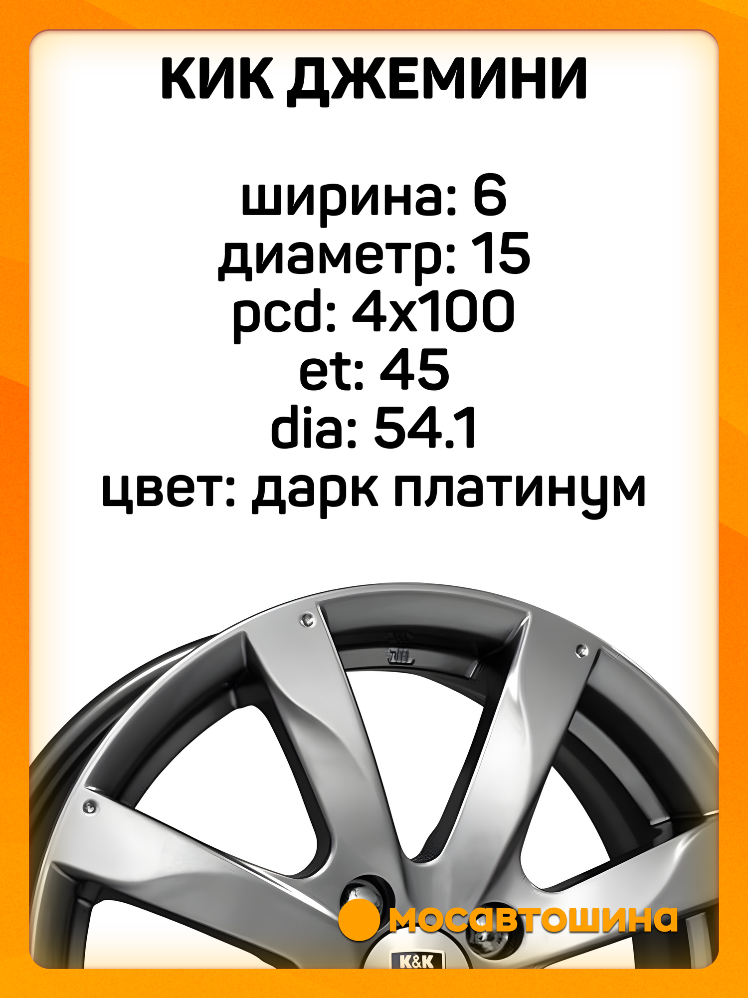 Купить Колесный диск КиК Джемини 6,0×15/4×100 ET45 D54,1 Дарк платинум с доставкой по всей России. Колесный диск КиК Джемини 6,0×15/4×100 ET45 D54,1 Дарк платинум: сравнение цен, характеристики, фото, актуальное наличие и цены.