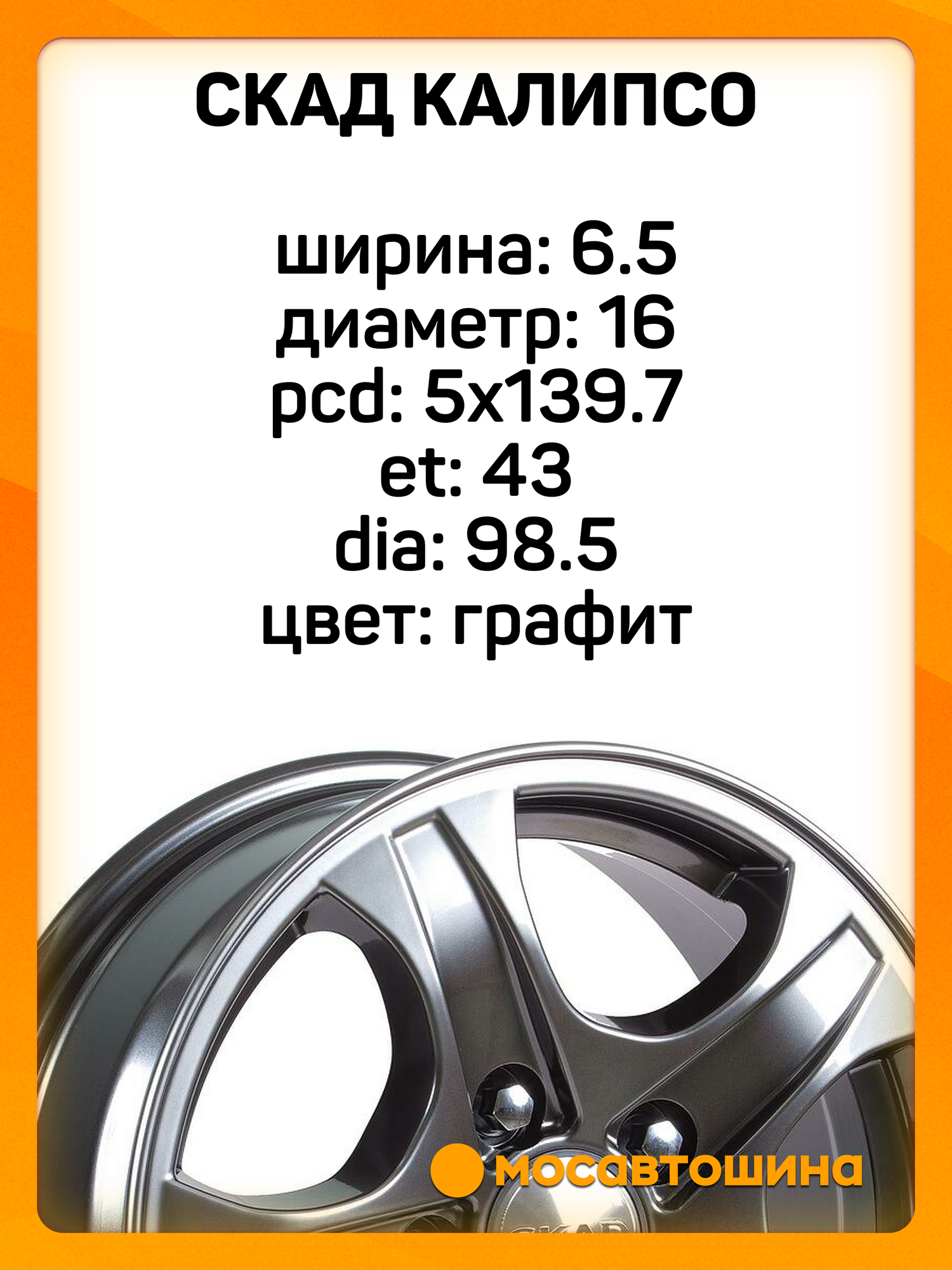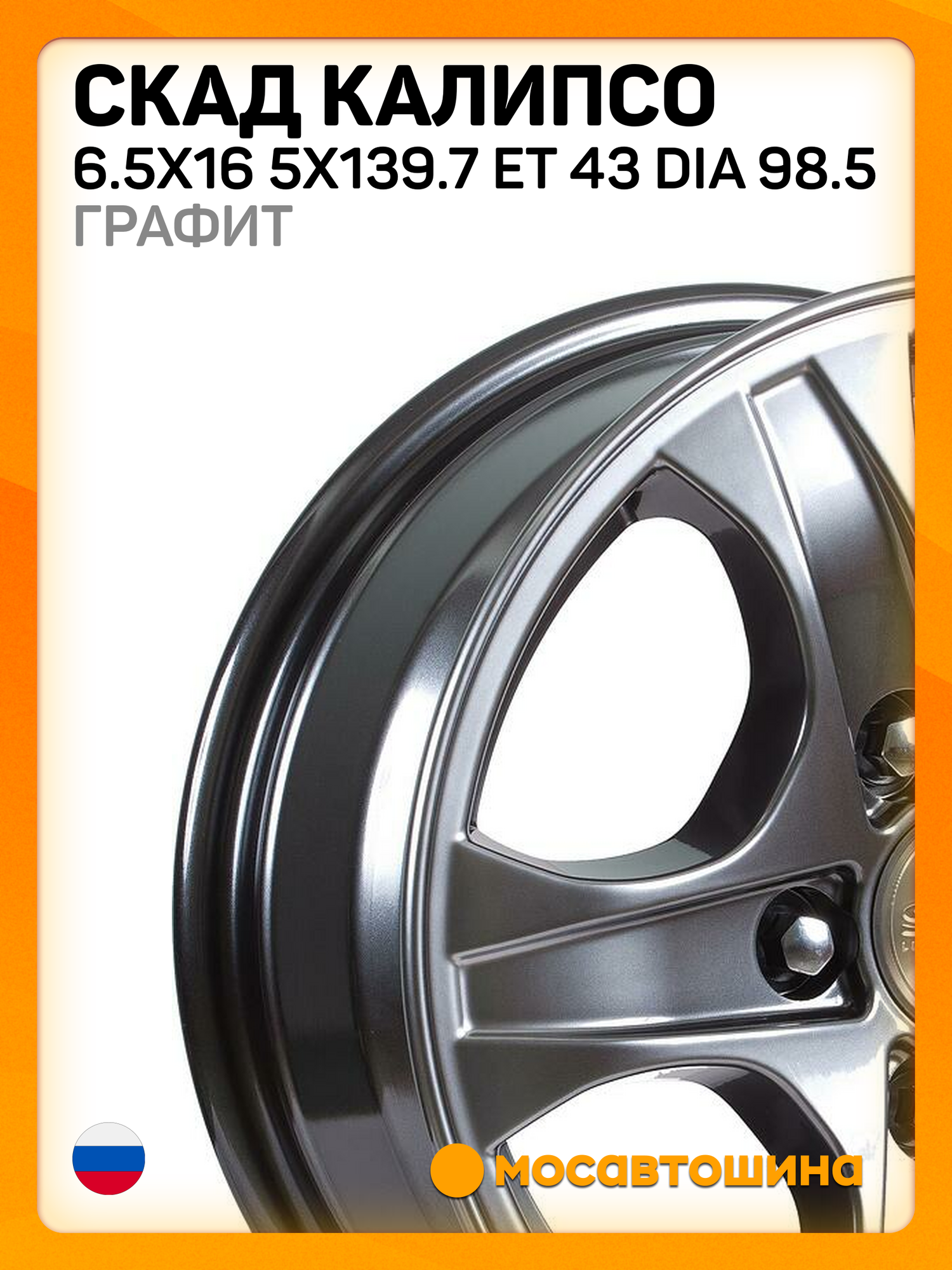 Купить Колесный диск Скад Калипсо (КЛ089) 6,5×16 5×139,7 ET43 98,5 Графит с доставкой по всей России. Колесный диск Скад Калипсо (КЛ089) 6,5×16 5×139,7 ET43 98,5 Графит: сравнение цен, характеристики, фото, актуальное наличие и цены.