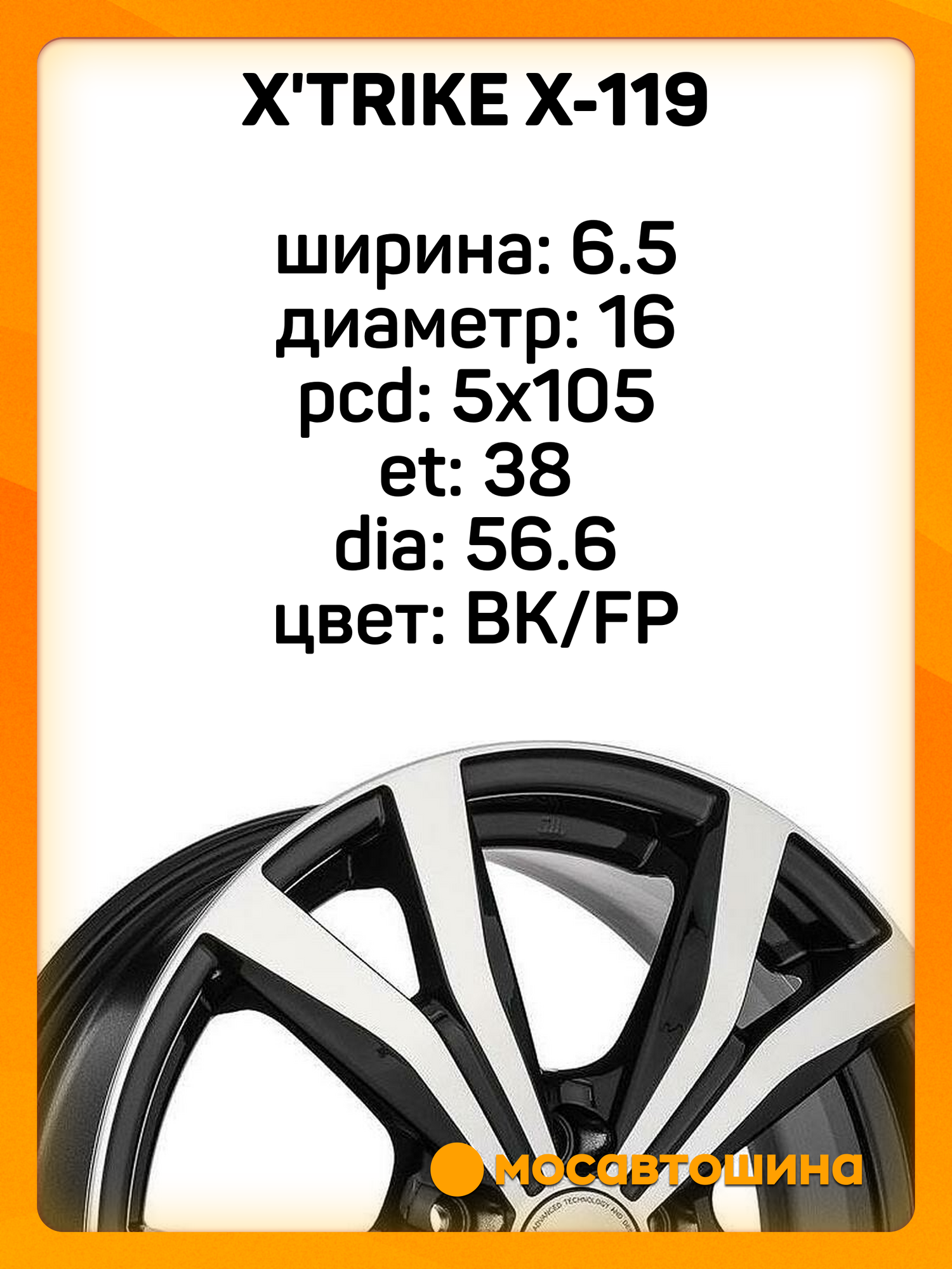 Литой колесный диск X-trike X-119 6.5×16/5×105 D56.6 ET38 BK/FP: сравнение цен, характеристики, фото, актуальное наличие и цены.