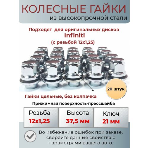 Колесные гайки цельные без колпачка для крепления оригинальных (штатных) дисков автомобиля INFINITI.- Материал: высокопрочная сталь. Класс прочности: 8.8 (соответствует требованиям к колесному крепежу мировых производителей автомобилей)- Резьба: 12х1.25- Высота, мм: 37,5-- Прижимная поверхность: прессшайба--Диаметр шайбы: 30 мм, Диаметр носика-20 мм, Высота носика: 12 мм, Покрытие: хром-- Ключ: 21 мм-Комплект: 20 шт.- Внимание!- Во избежании ошибок при заказе гаек для колес, сверяйте данные свойства с параметрами вашего авто. Обращайте внимание на диаметр, шаг резьбы и прижимную поверхность.