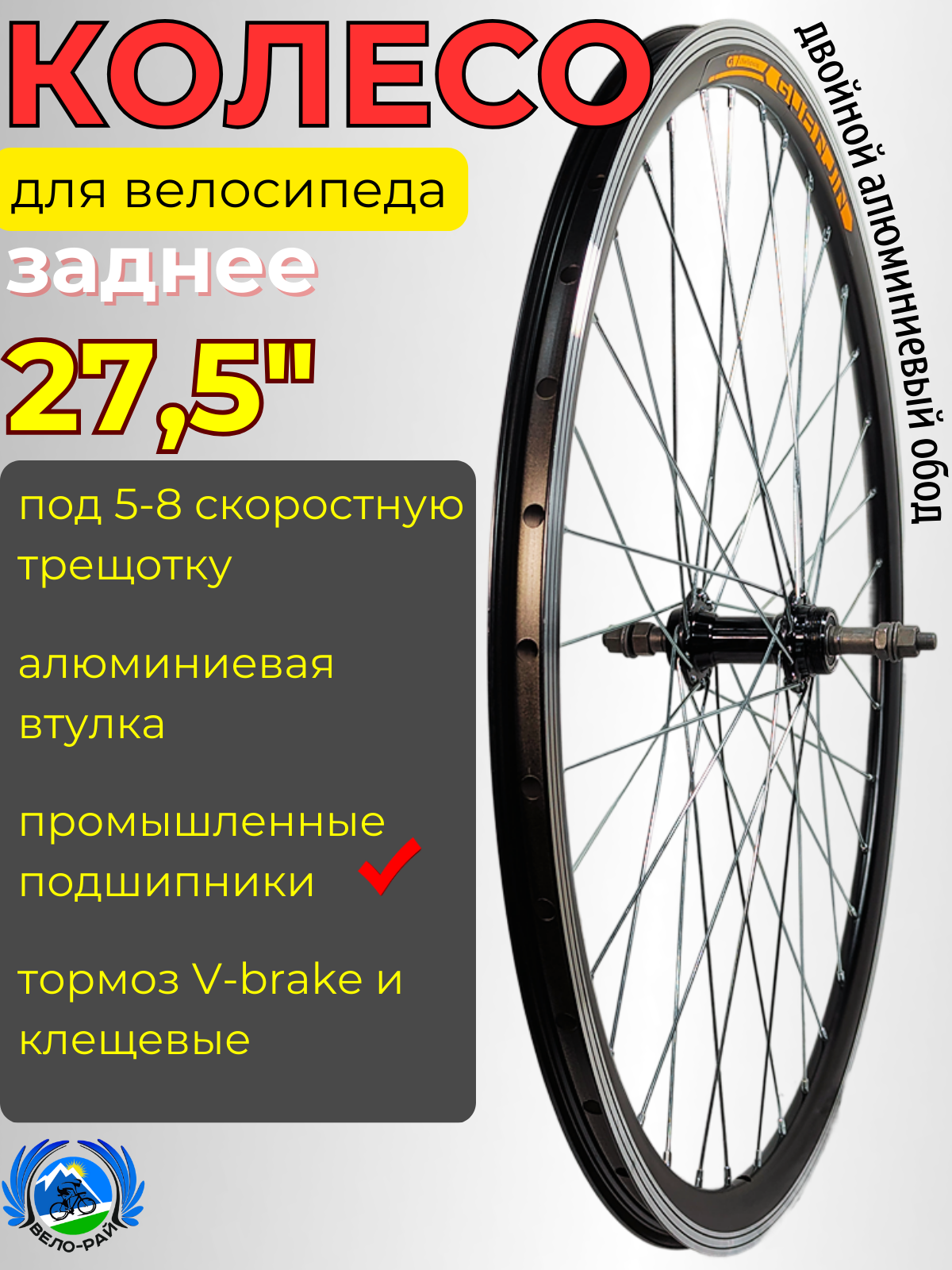 Колесо для велосипеда 27,5" заднее под 5-8 скоростную трещотку на промышленных подшипниках от бренда Вело-рай представляет собой идеальное решение для владельцев городских, шоссейных и спортивных велосипедов.