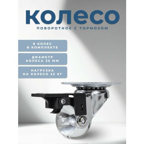 Колесо мебельное на площадке с тормозом 35 мм BRANTE, полупрозрачный полиуретан, комплект 8 шт, ролики для прикроватных тумбочек, журнальных столиков, тумб, шкафчиков, колесики для мебели
