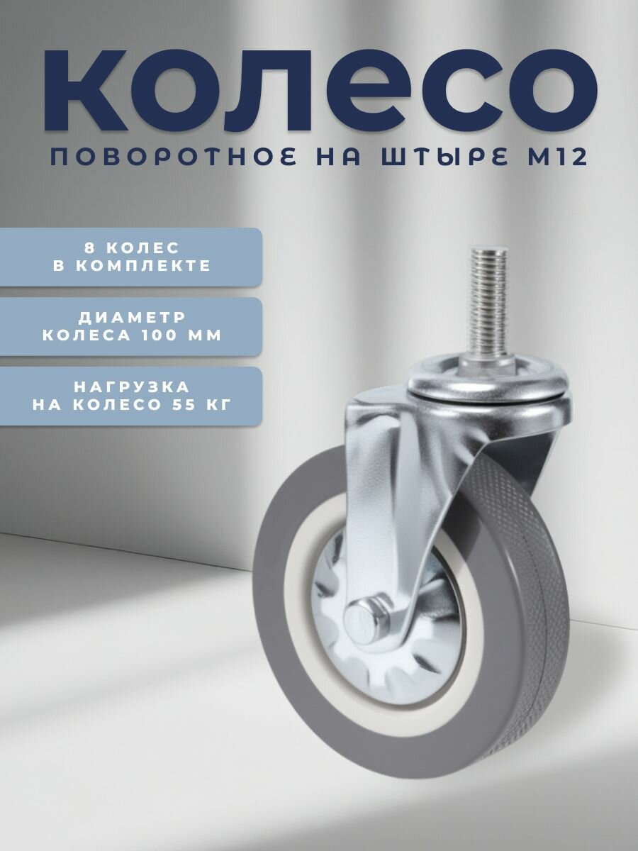 Купить Колесо мебельное поворотное 100 мм BRANTE на штыре М12, комплект 8 шт, серая резина (33100T), ролик для прикроватных тумбочек, журнальных столиков, тумб, шкафчиков, колесики для мебели с доставкой по всей России.