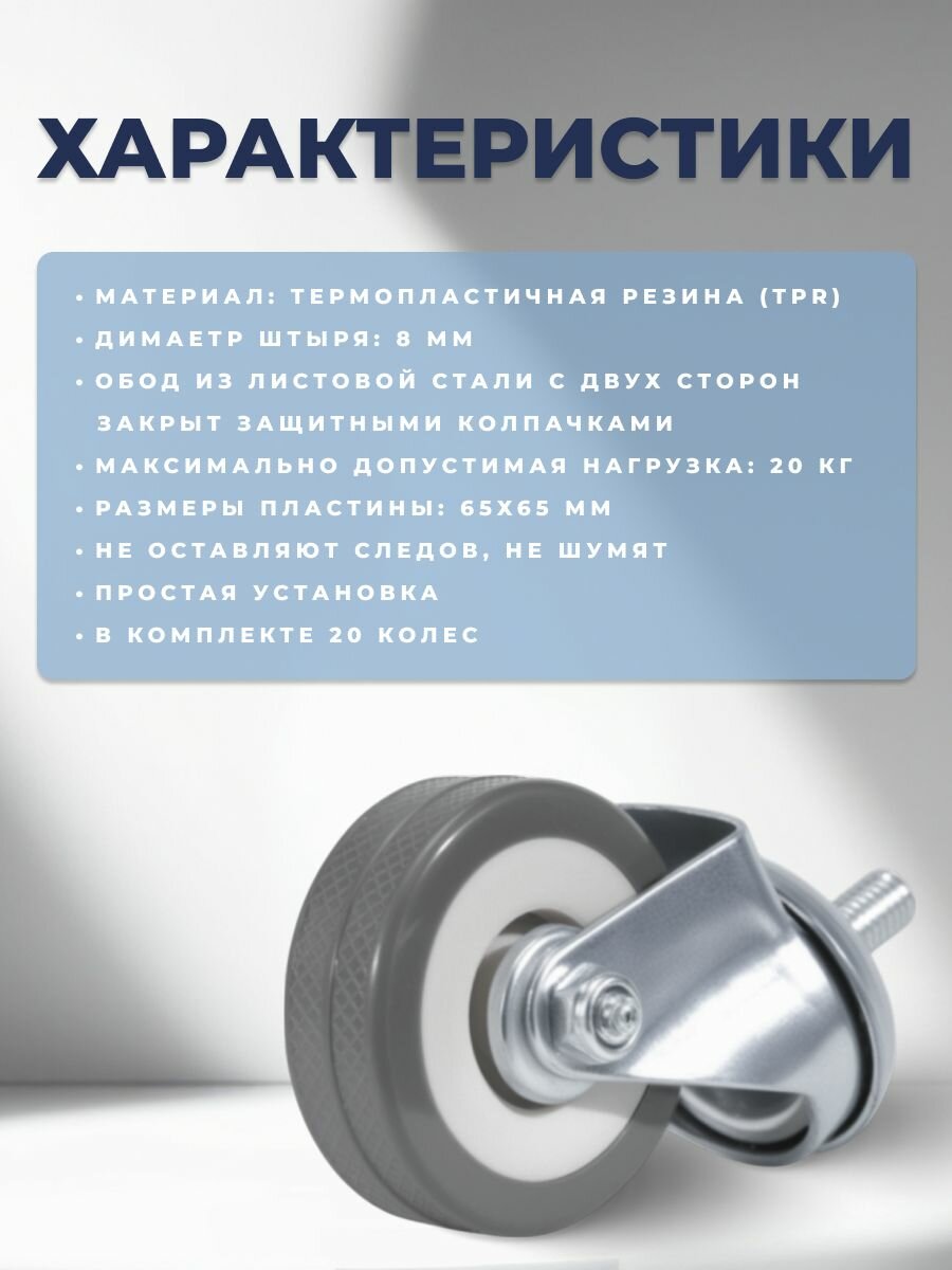 Купить Колесо поворотное на штыре 50 мм BRANTE, серая резина (33050T), комплект 20 шт, ролики для прикроватных тумбочек, журнальных столиков, тумб, шкафчиков, колесики для мебели с доставкой по всей России.