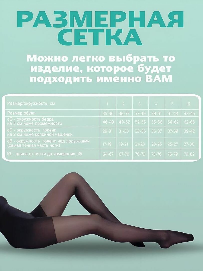 Колготки выполнены из комбинированного синтетического материала (полиамид/эластан), что обеспечивает их долговечность и комфорт при носке. Закрытый носок и точная градуированная схема распределения компрессионного воздействия (в области лодыжек – 100%, верхней трети голени – 70%, бедренной области – 40%) гарантируют эффективность лечения и профилактики.