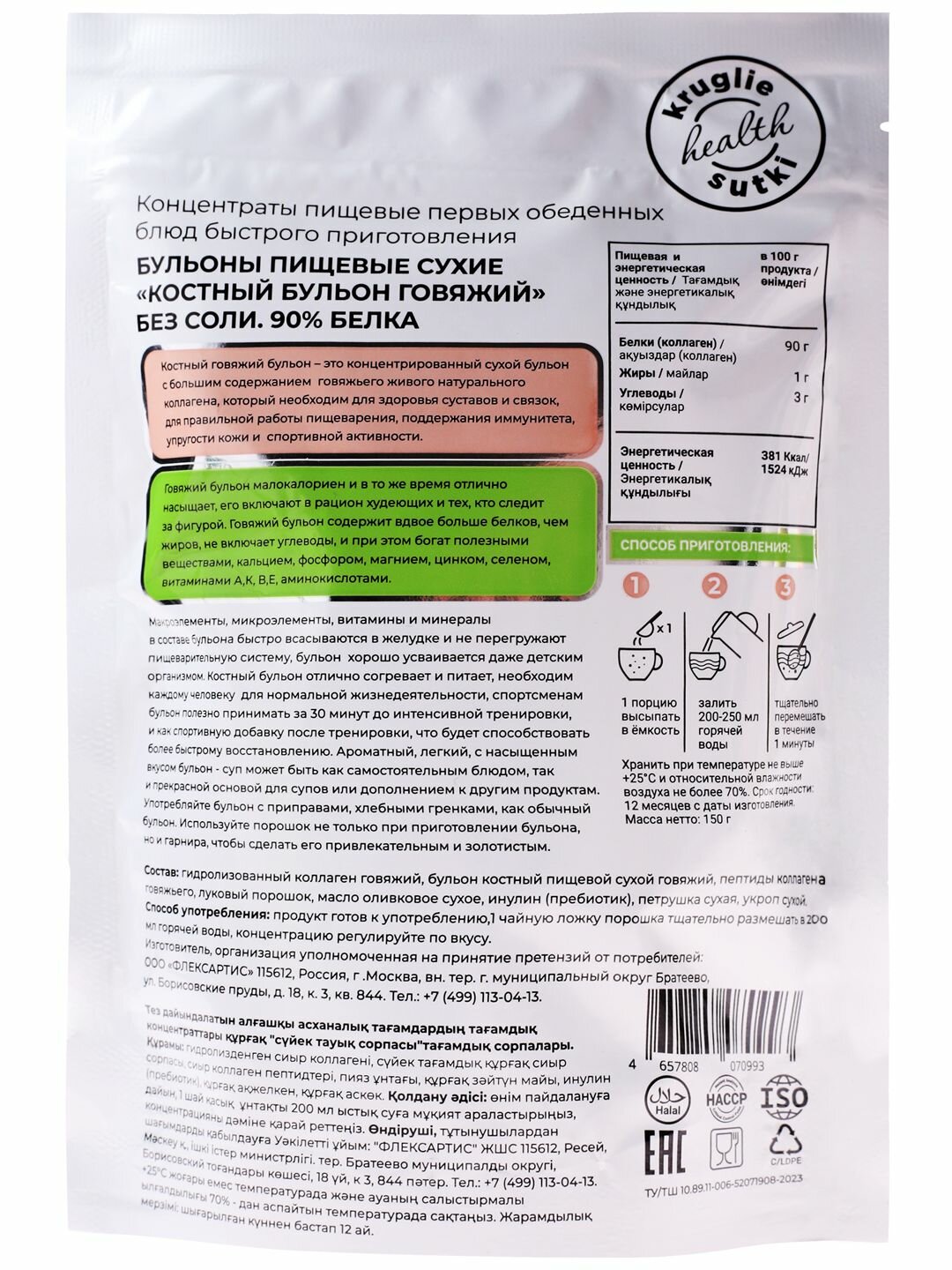 Ароматный, легкий, с насыщенным вкусом Бульон Костный Говяжий 90% без соли– это сухой концентрированный бульон с большим содержанием живого натурального говяжьего Коллагена, который необходим организму: