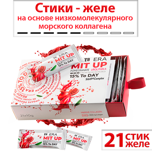 T8 ERA MIT UP — инновационные стики-желе, содержащие в составе 4 активных компонента, которые легко усваиваются организмом, способствуют формированию новых клеток и восстанавливают энергию в виде молекул АТФ. Только комбинация из SibXPComplex, морского коллагена, экстракт граната (Уролитин А) и витамина С позволяет добиться максимального результата сразу в нескольких направлениях: клеточного обновления и омоложения, укрепления и повышения эластичности кожи.