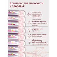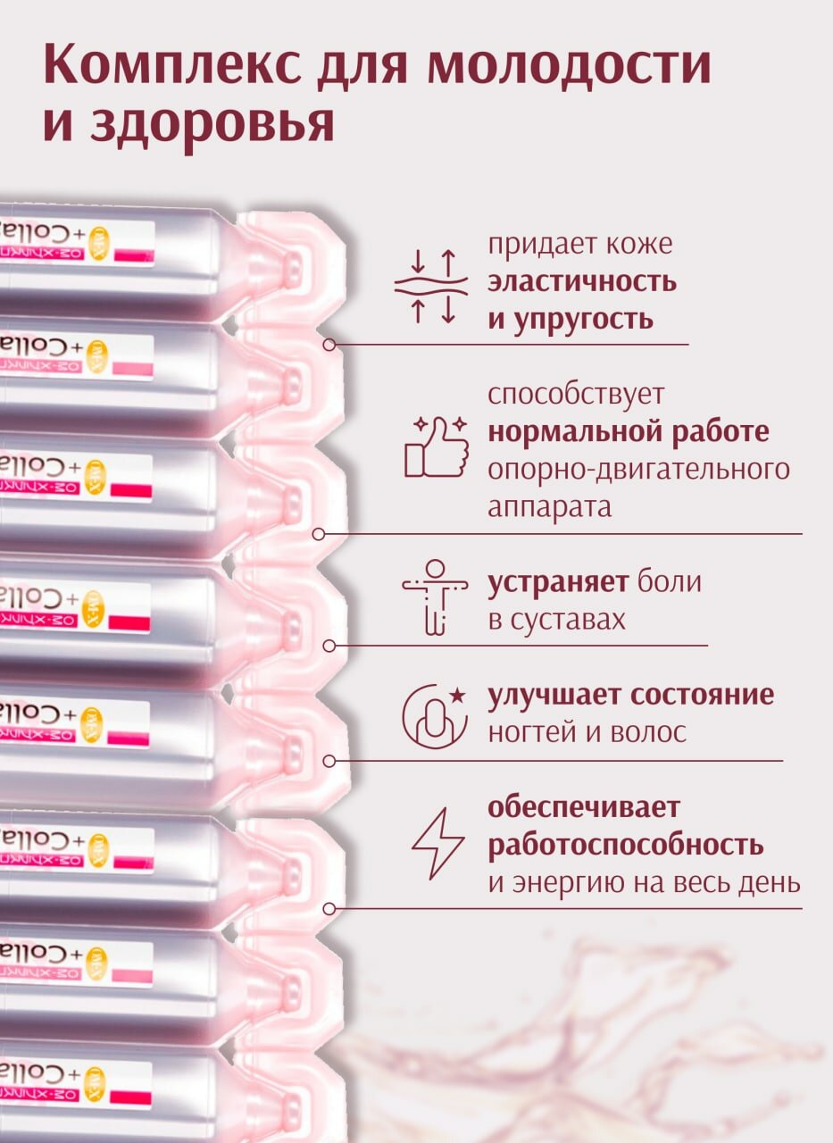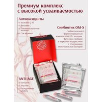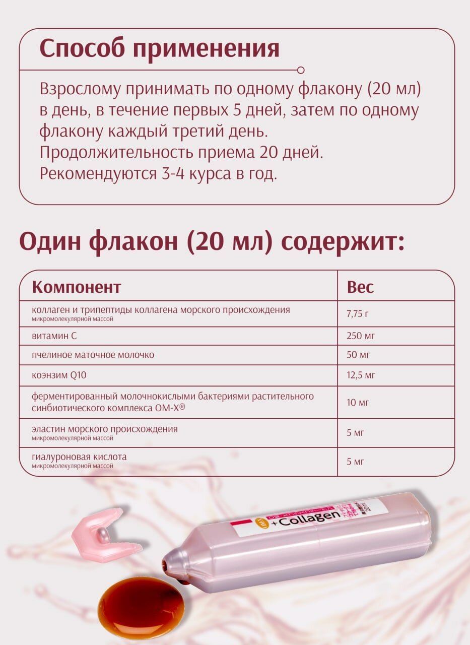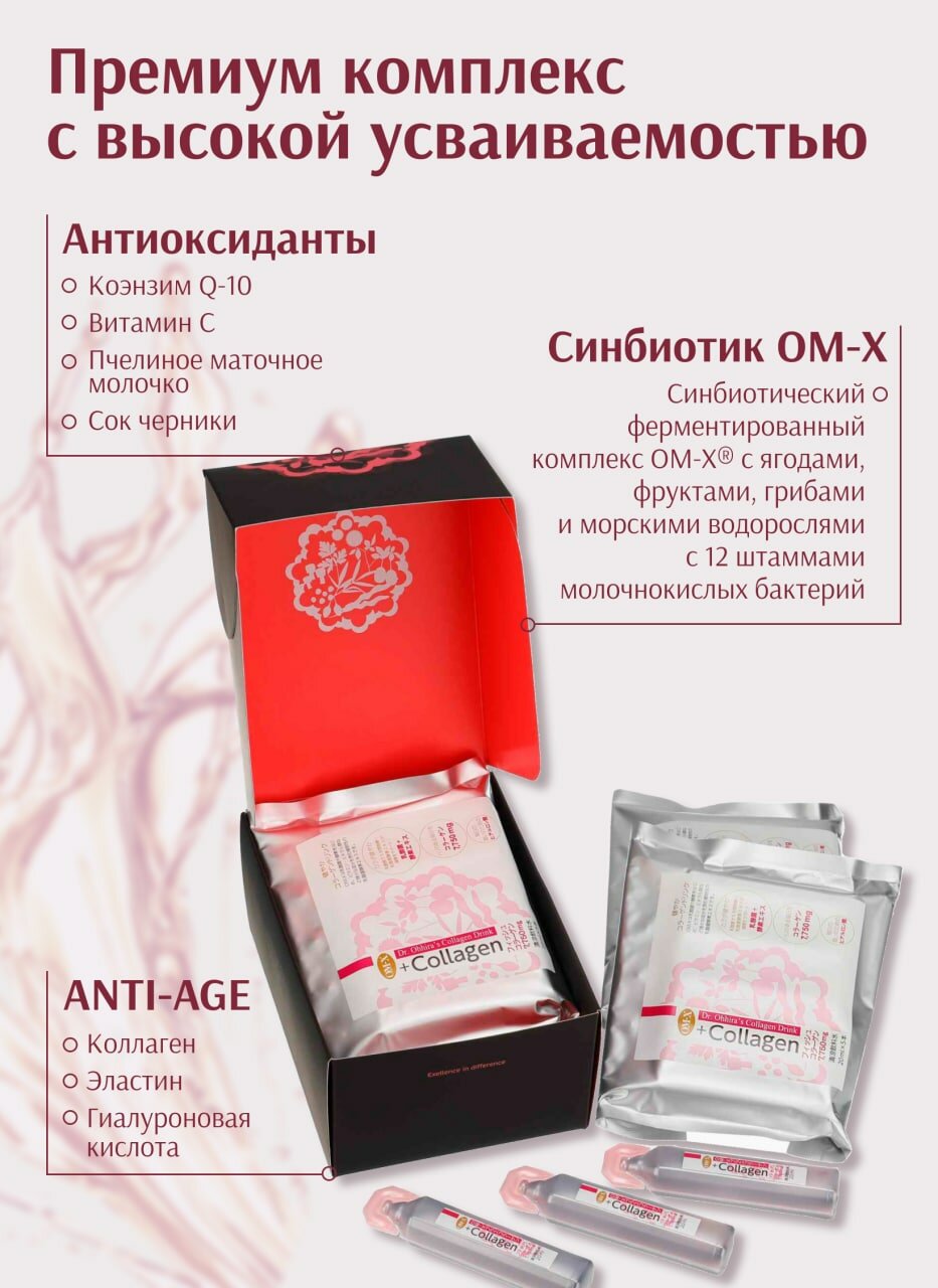 Синергично действующий комплекс ANTI-AGE TRIO: Коллаген + Эластин + Гиалуроновая кислота Употребление питьевого Коллагена ОМ-Х® плюс от Dr. OHHIRА рекомендуется в целях – продления молодости и сохранения красоты (придает коже эластичность и упругость) – является источником витамина С и способствует нормальному функционированию опорно-двигательного аппарата – для устранения боли в суставах – улучшения состояния ногтей и волос – обеспечения работоспособности и энергии на весь день